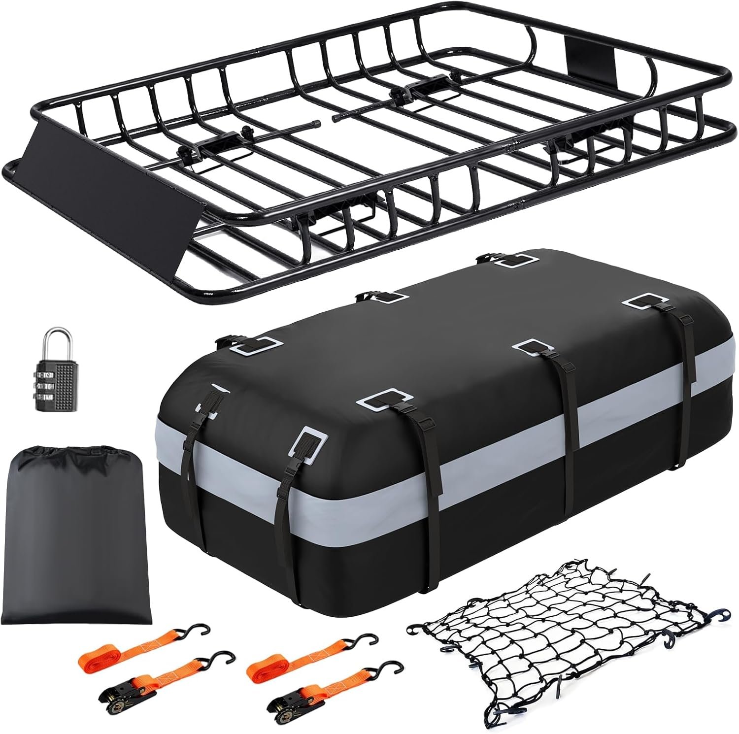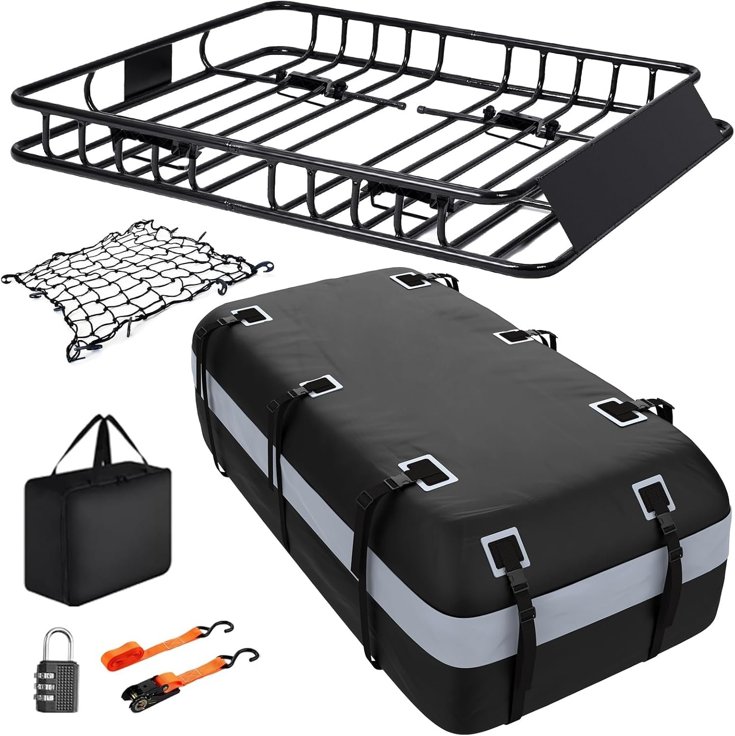 MeeFar Roof Rack Carrier Basket Universal Rooftop 51″ X 36″ X 5″ + Waterproof Bag 15 Cubic Feet (44″ 34″ 17″), and Cargo Net with Attachment Hooks, Ratchet Straps