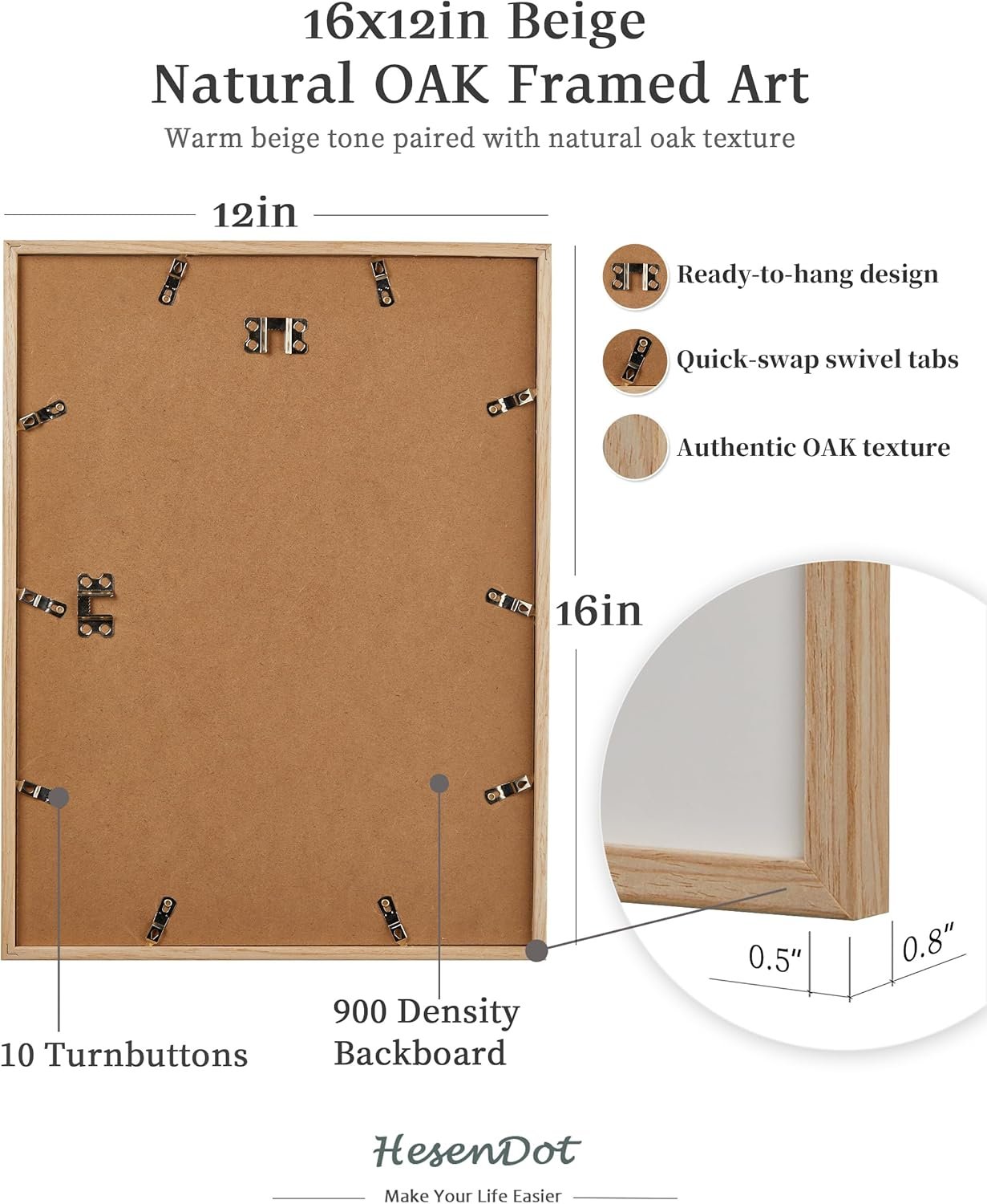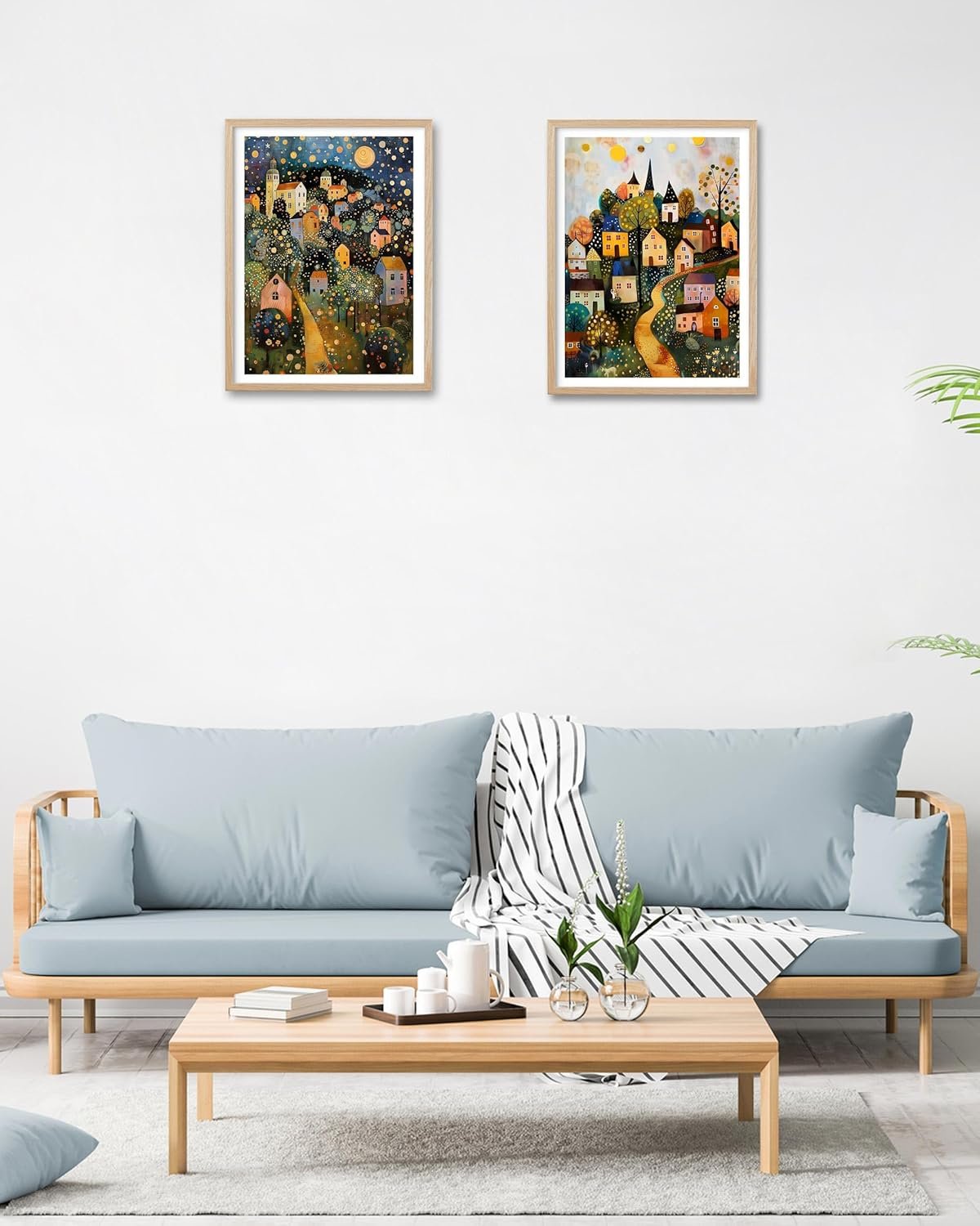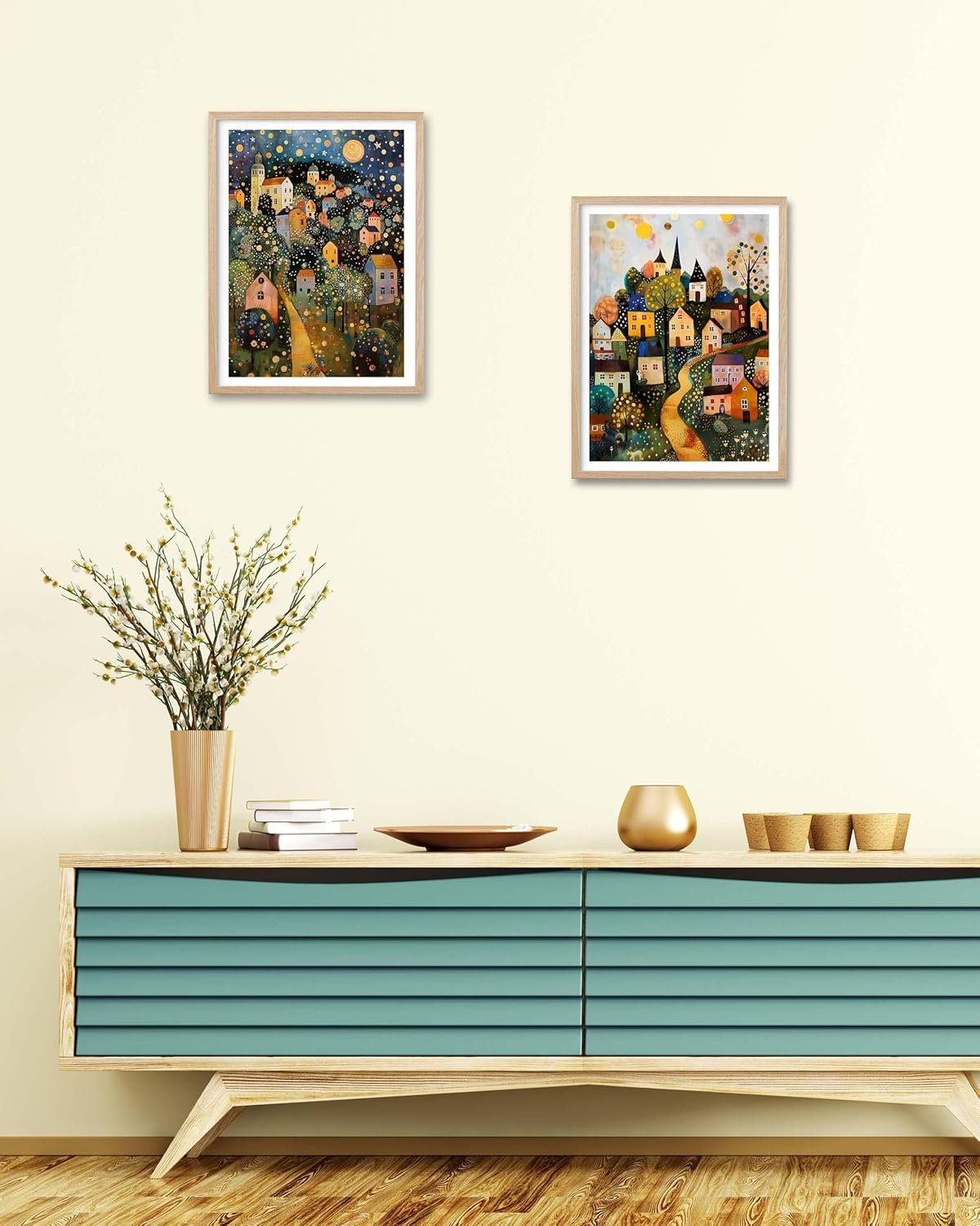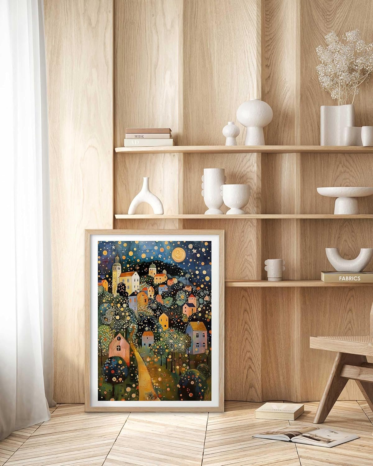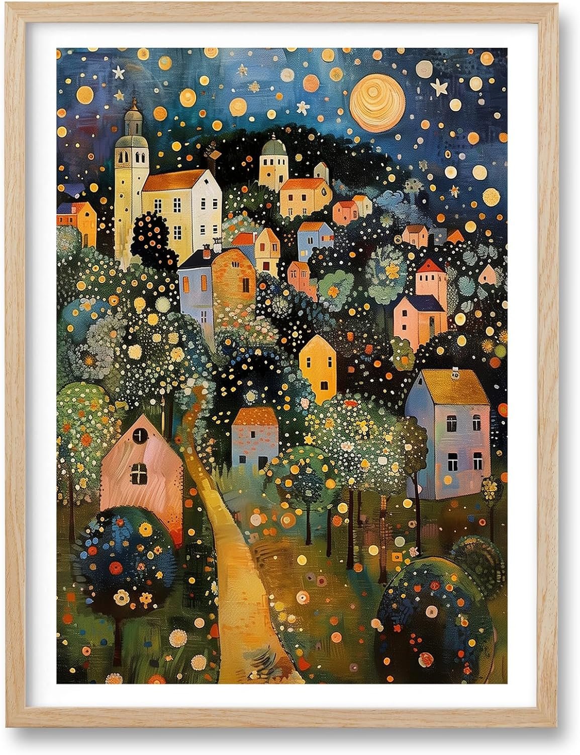 HesenDot Natural OAK Wood Frame Wall Art,12x16in Gustav Klimt Style Moon Stars Tree Canvas Print Posters Art,Village Night Wall Decor for Living Room Bedroom Home, Set of 1