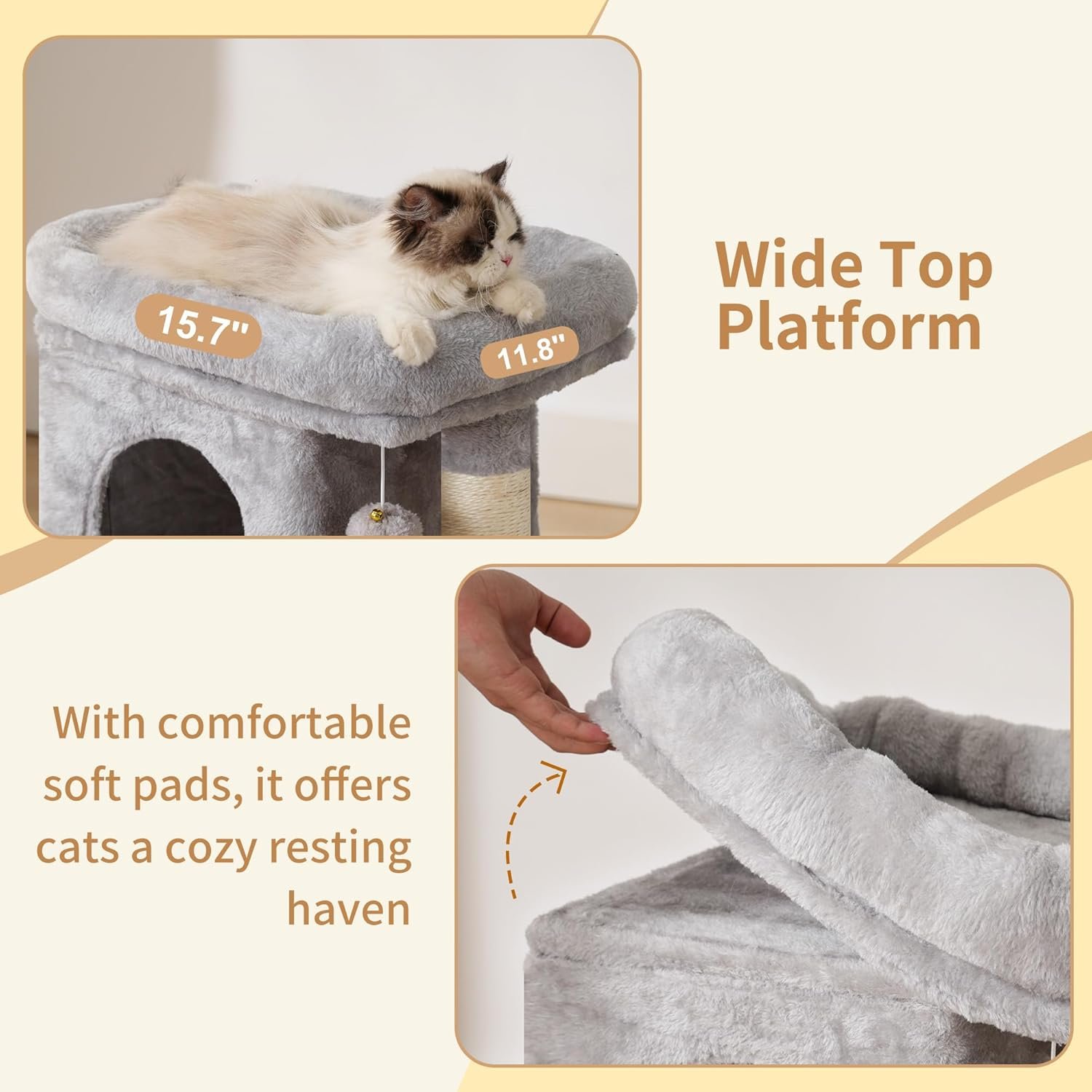Heybly Cat Tree, 49.2 Inches Cat Tower for Indoor Cats, Spacious Cat House Condo with Hidden Space,Sturdy Steel Tube,Soft Plush Top Perch,Cozy Hammock and Sisal Scratching Posts, Light Gray HCT200SW