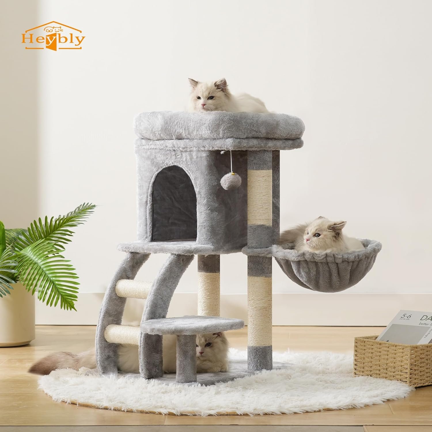 Heybly Cat Tree Tower, Cat condo for Indoor Kittens, Cat House with Wide Plush Top Perch, Ladder, Basket, Sisal-Covered Scratching Posts, Cozy Activity Center for pet, Light Gray HCT009SW