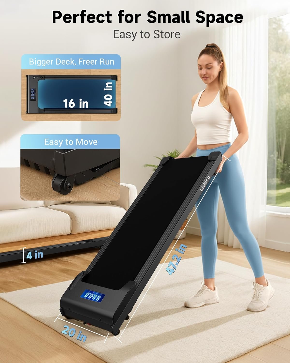 Lichico NeoSilent Walking Pad Treadmill Under Desk for Home with BLDC Core and Extra-Large Belt, App and Remote Control, Portable and Compact for Small Space