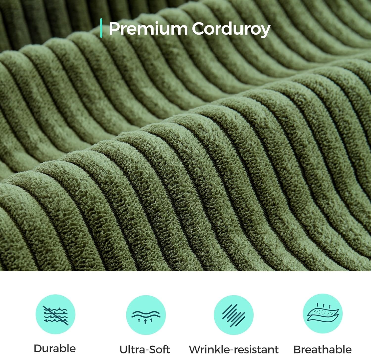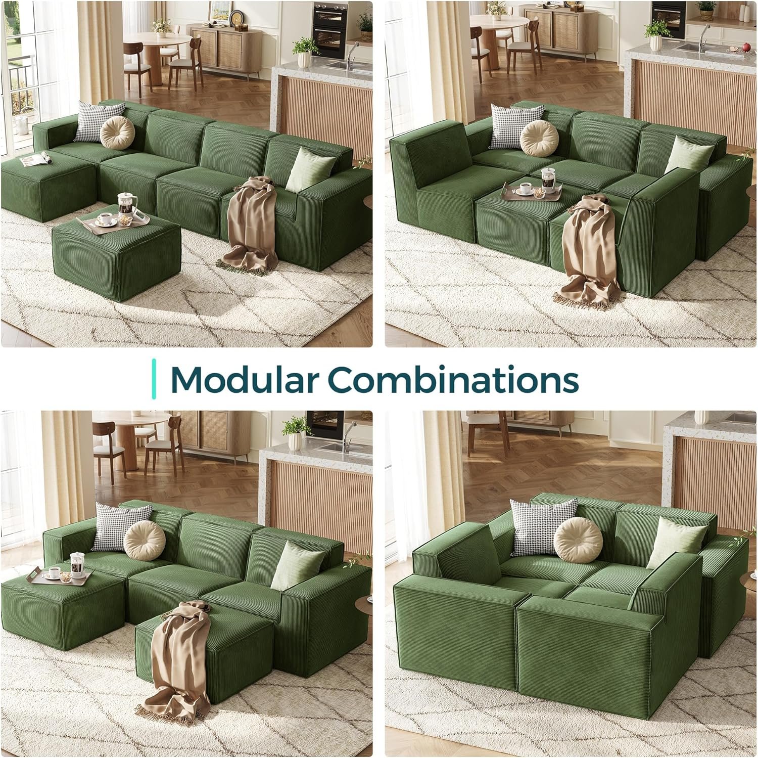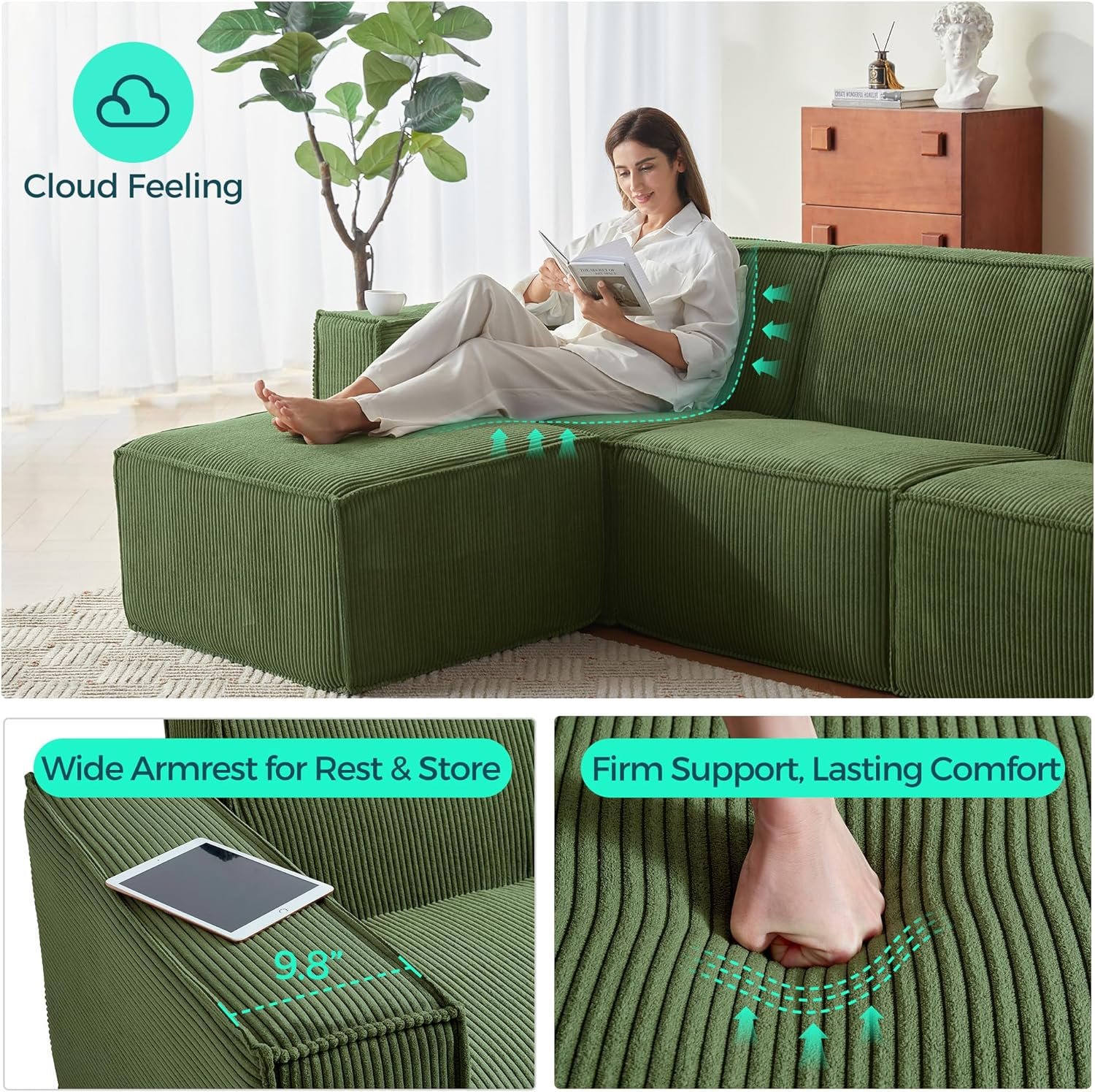 LINSY HOME Modular Sectional Sofa, 105″ Boneless Couch U Shaped 3-Seat Sofa with 2 Ottomans, Corduroy Sectional Cloud Couches for Living Room, No Assembly Required, Green