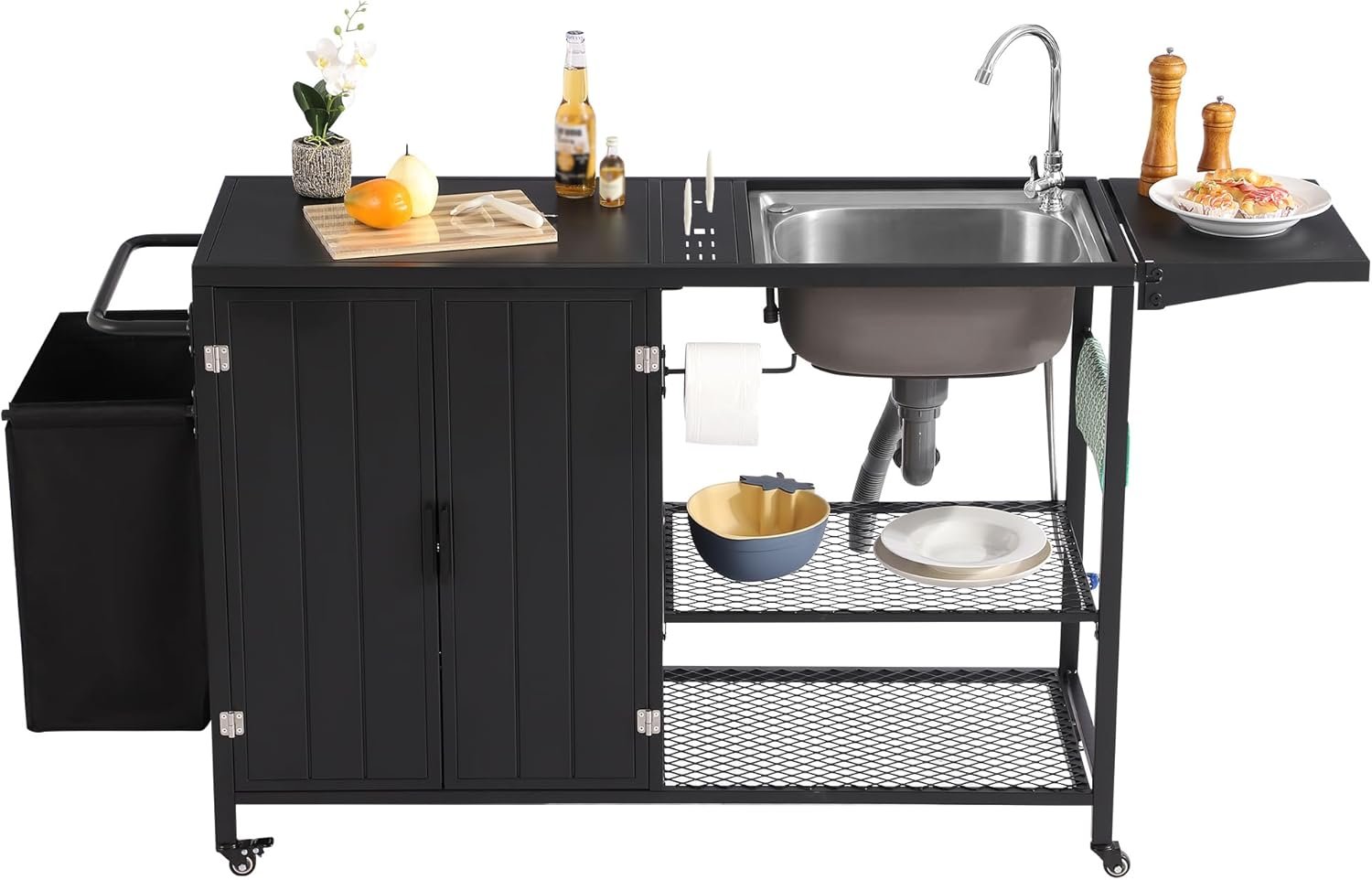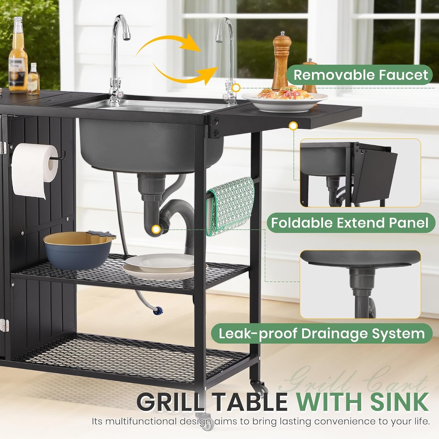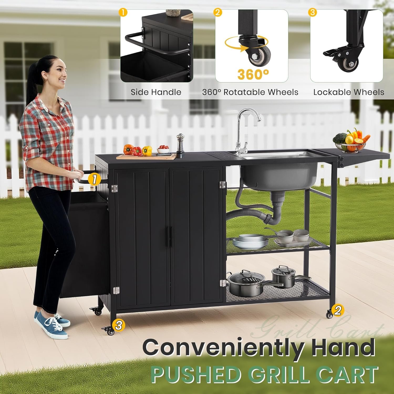 LVUYOYO Outdoor Grill Table with Stainless Steel Sink, Grill Cart Station with Cabinet, Metal Kitchen & Island Rolling BBQ Table for Garden, Patio, Backyard