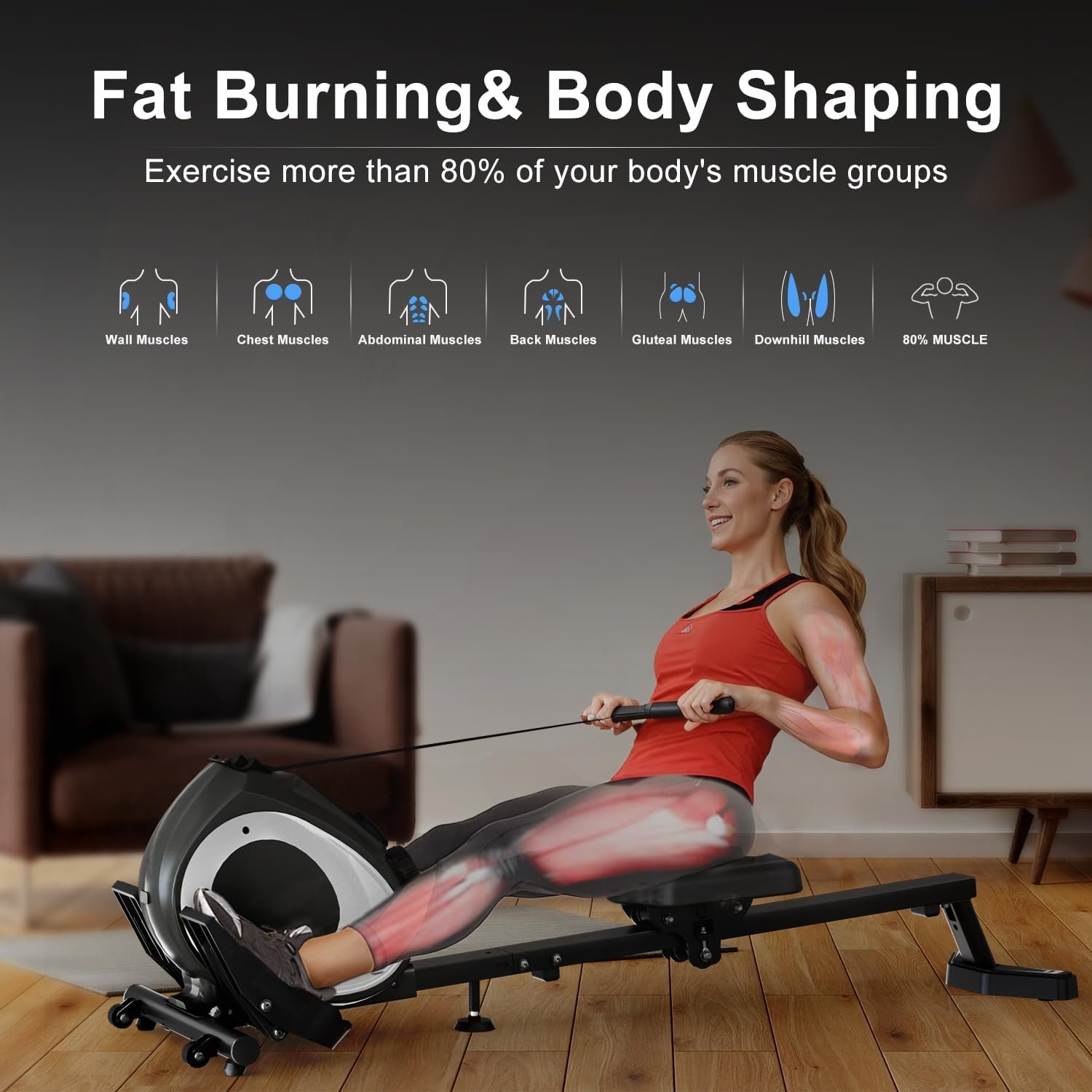 Magnetic Rowing Machine for Home | Adjustable 8-Speed Booster | Burn Fat & Sculpt Muscles | Supports Up to 265 LBS | Phone/Tablet-Ready Design