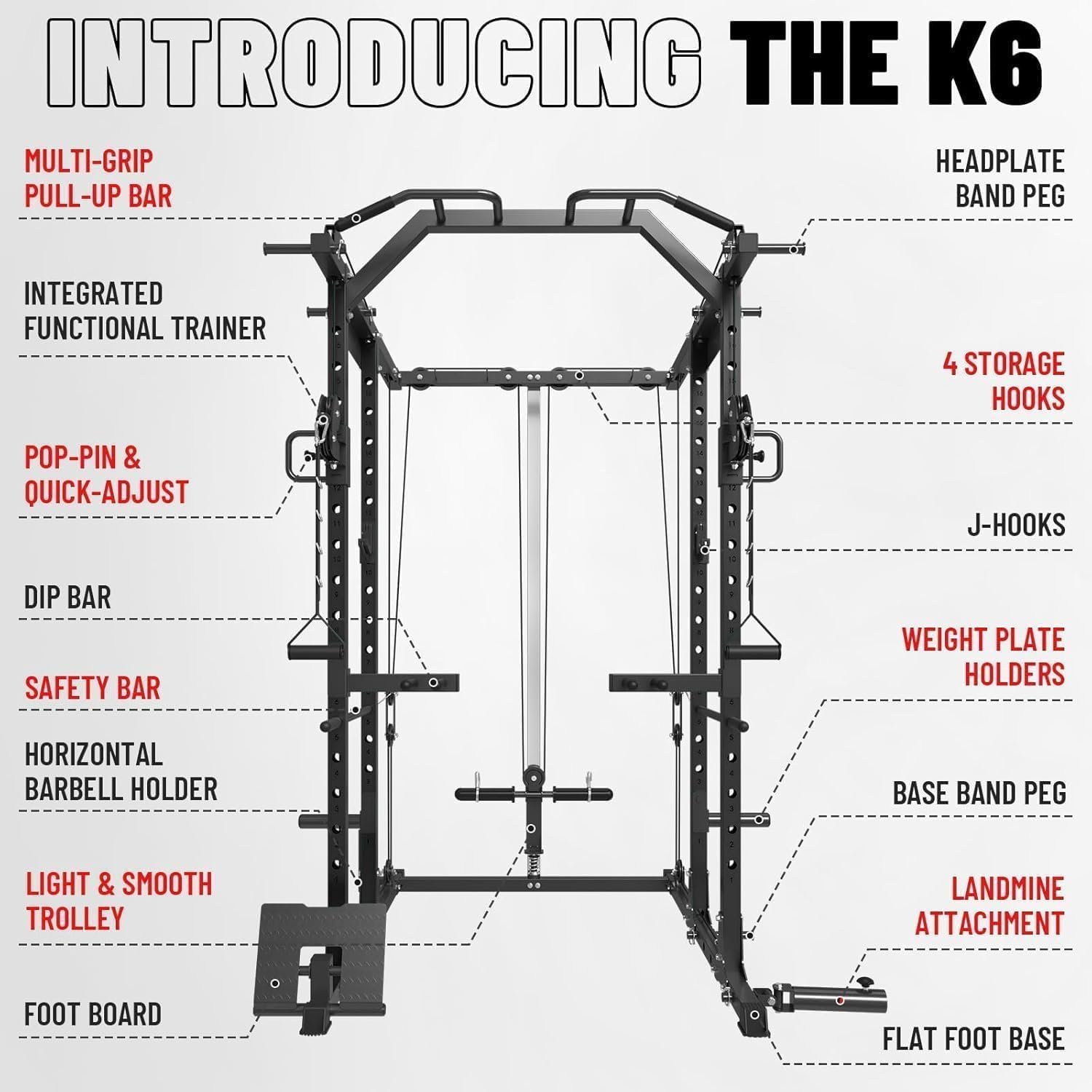 Smith Machine Home Gym All in One, 2200LBS Squat Rack Power Cage with Smith Bar, LAT Pull-Down, Cable Systems, Leg Hold-Down and More Attachments, Workout Equipment (Red Black)