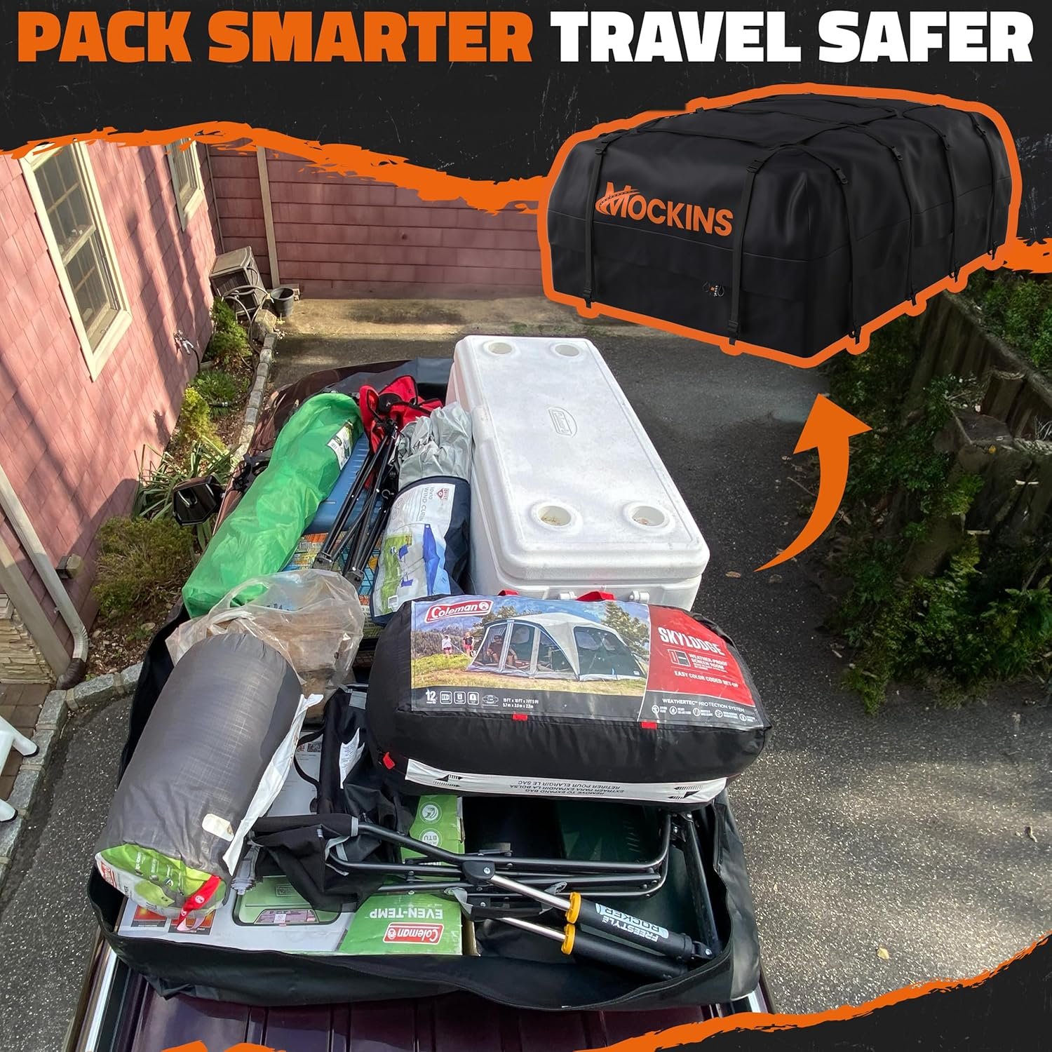 Mockins 35 Cu.Ft. Black Waterproof Rooftop Cargo Carrier Bag | 60″x42″x24″ Car Roof Bag for Use with or w/o Roof Rack | Car Topper Luggage Carrier Waterproof Storage Set w/Mat, Straps, Hooks, & More