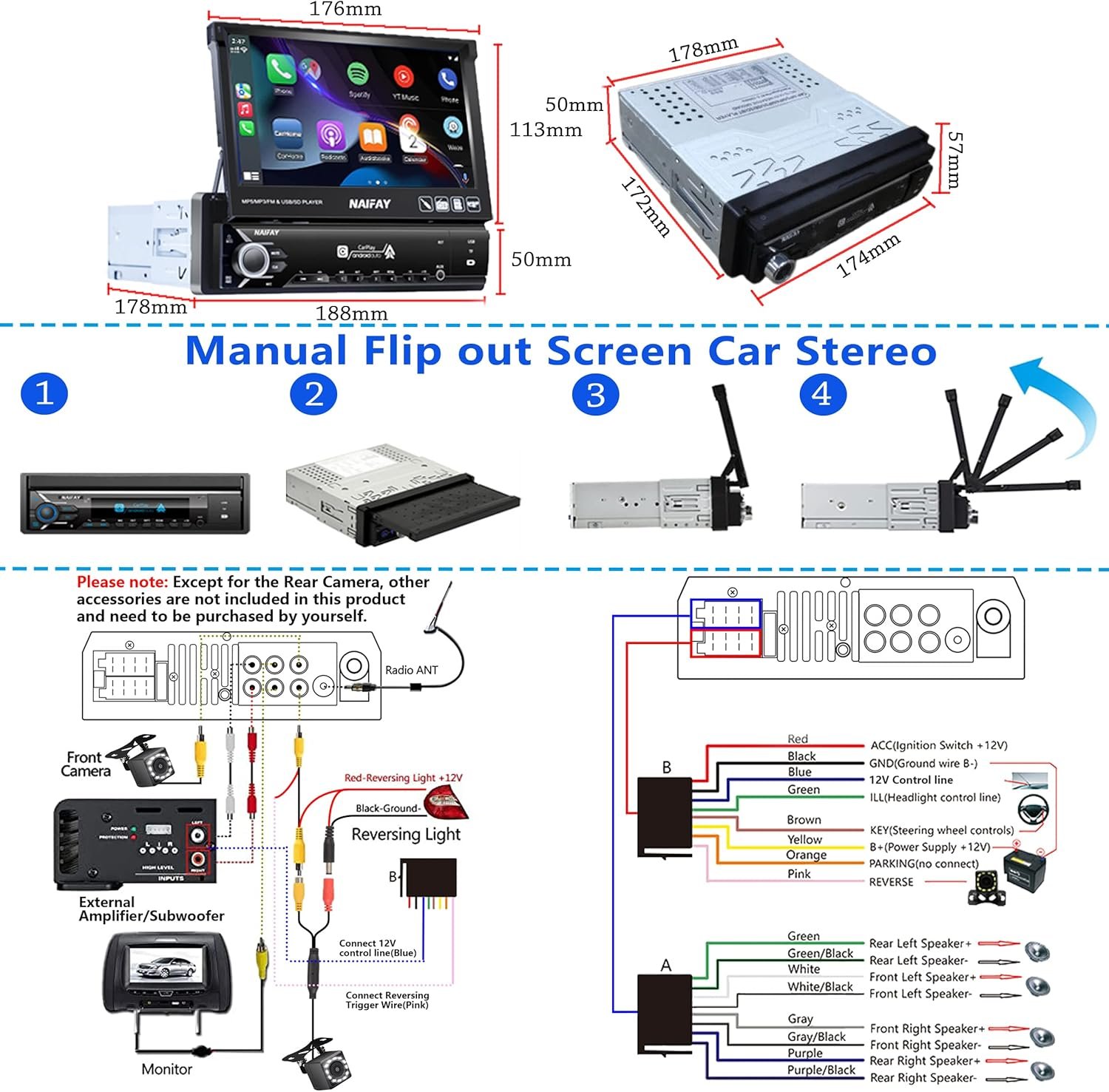Naifay Single Din Touchscreen Car Stereo with Carplay & Android Auto, 7inch Flip Out Screen Car Stereo with Bluetooth Car Audio Receivers, Backup Camera, FM Radio/Mirror Link/USB/AUX/TF/Subwoofer