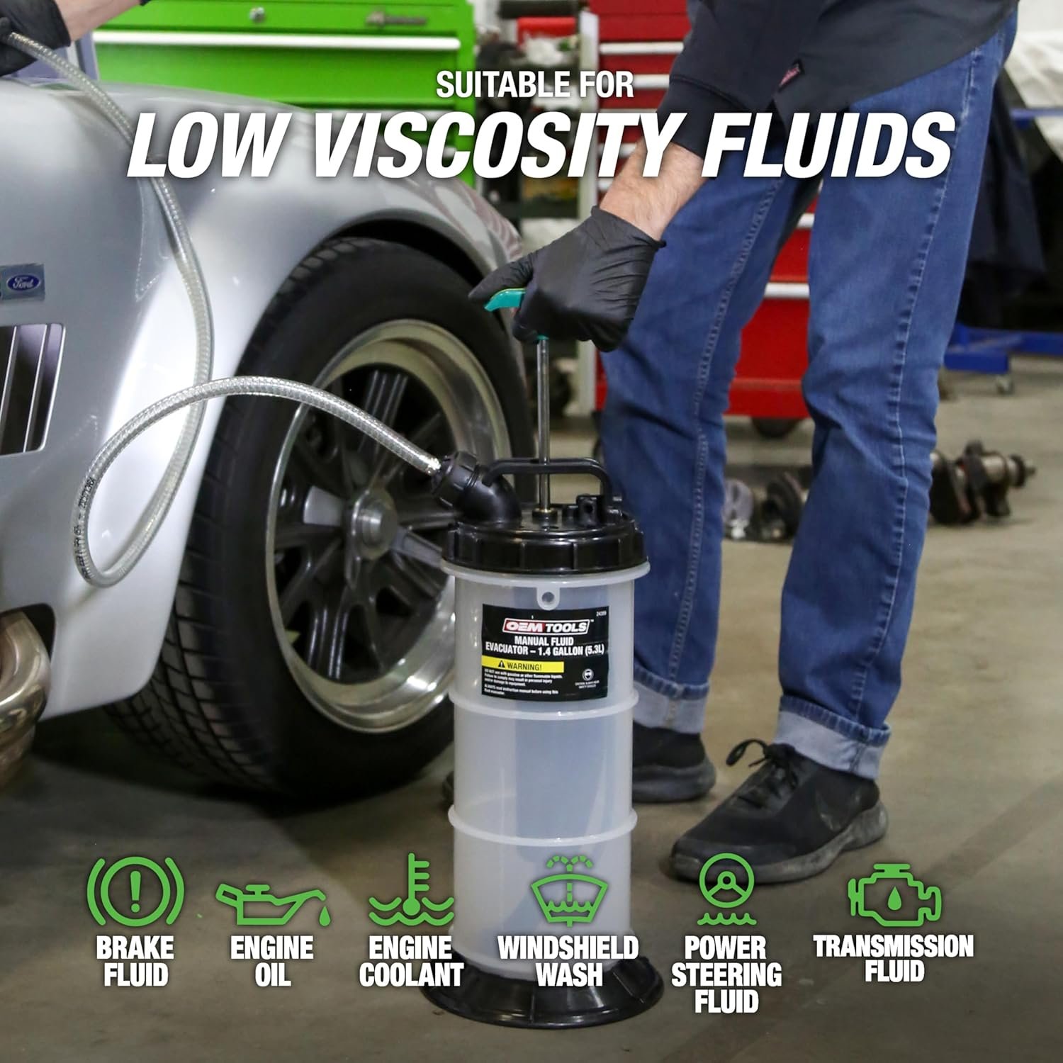 OEMTOOLS 24389 Manual Fluid Extractor Pump, 1.4 Gallon (5.3L) Oil Extractor Pump Capacity, Use for Oil, Coolant, and Transmission Fluid, 2 Dipstick Adapters, 5ft Hose