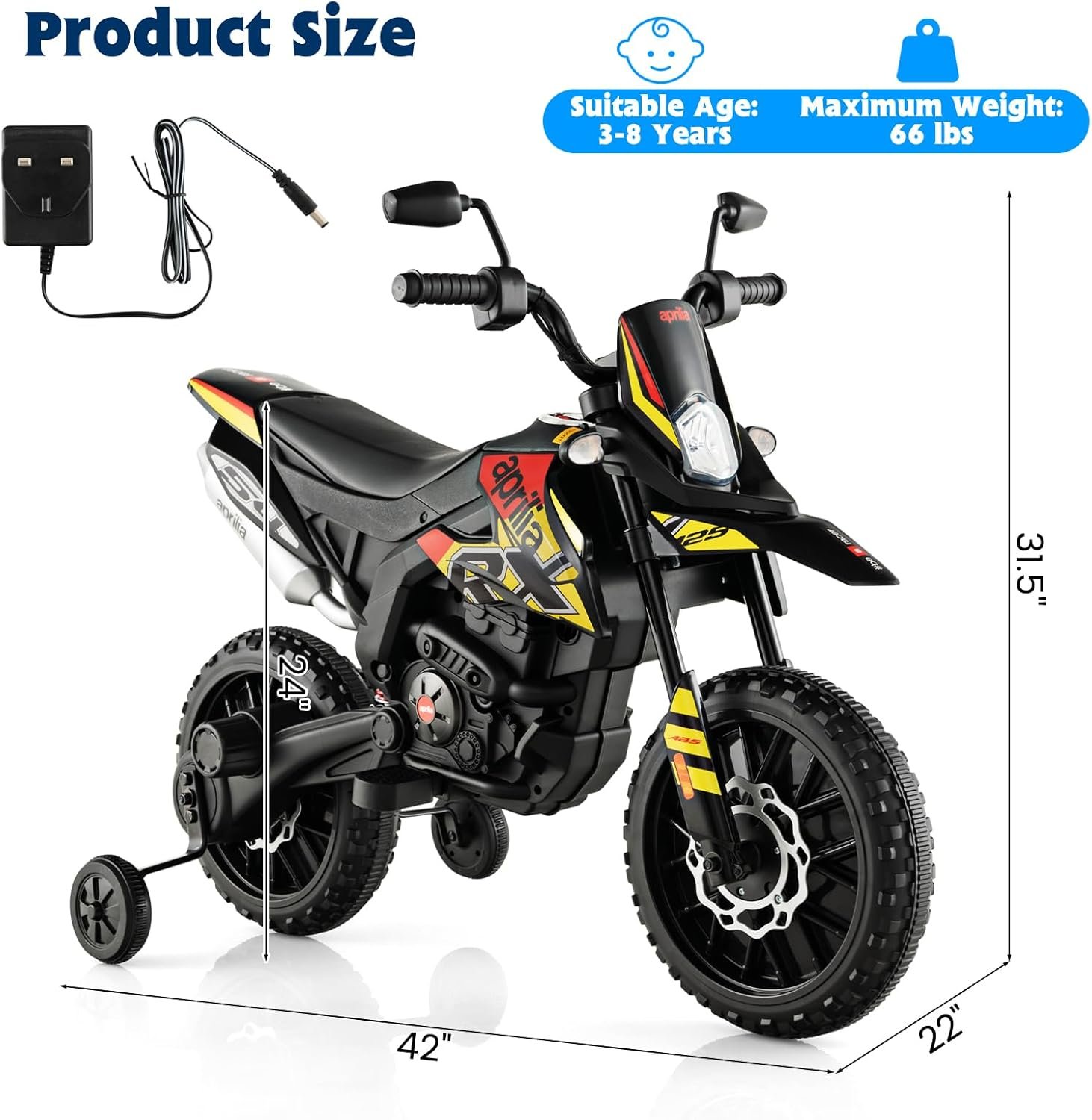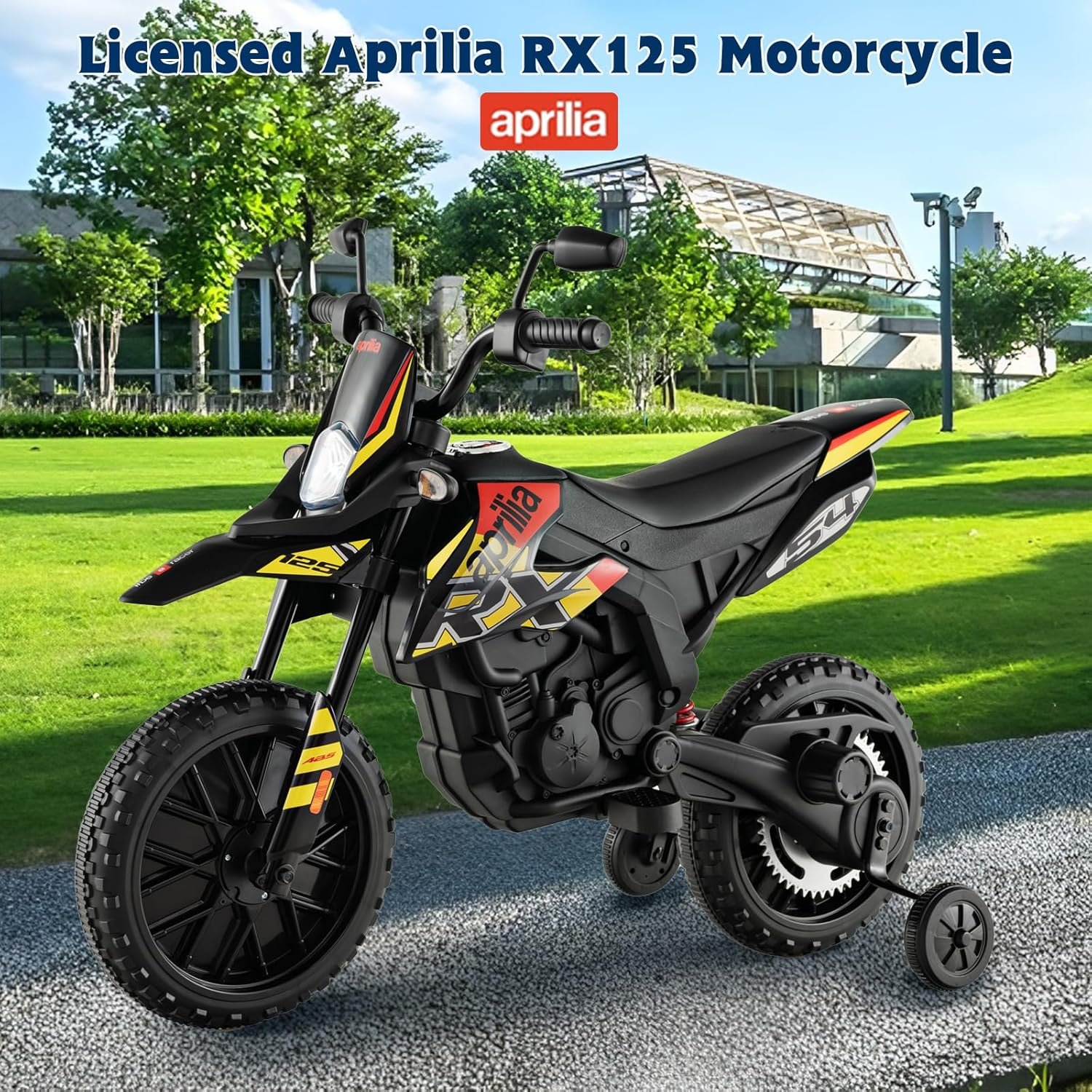 OLAKIDS Kids Motorcycle, Licensed Aprilia RX125 12V Ride on Electric Dirt Bike with Training Wheels, Spring Suspension, Battery Powered Off Road Motorbike Toy with Bluetooth, USB, Lights (Dark)