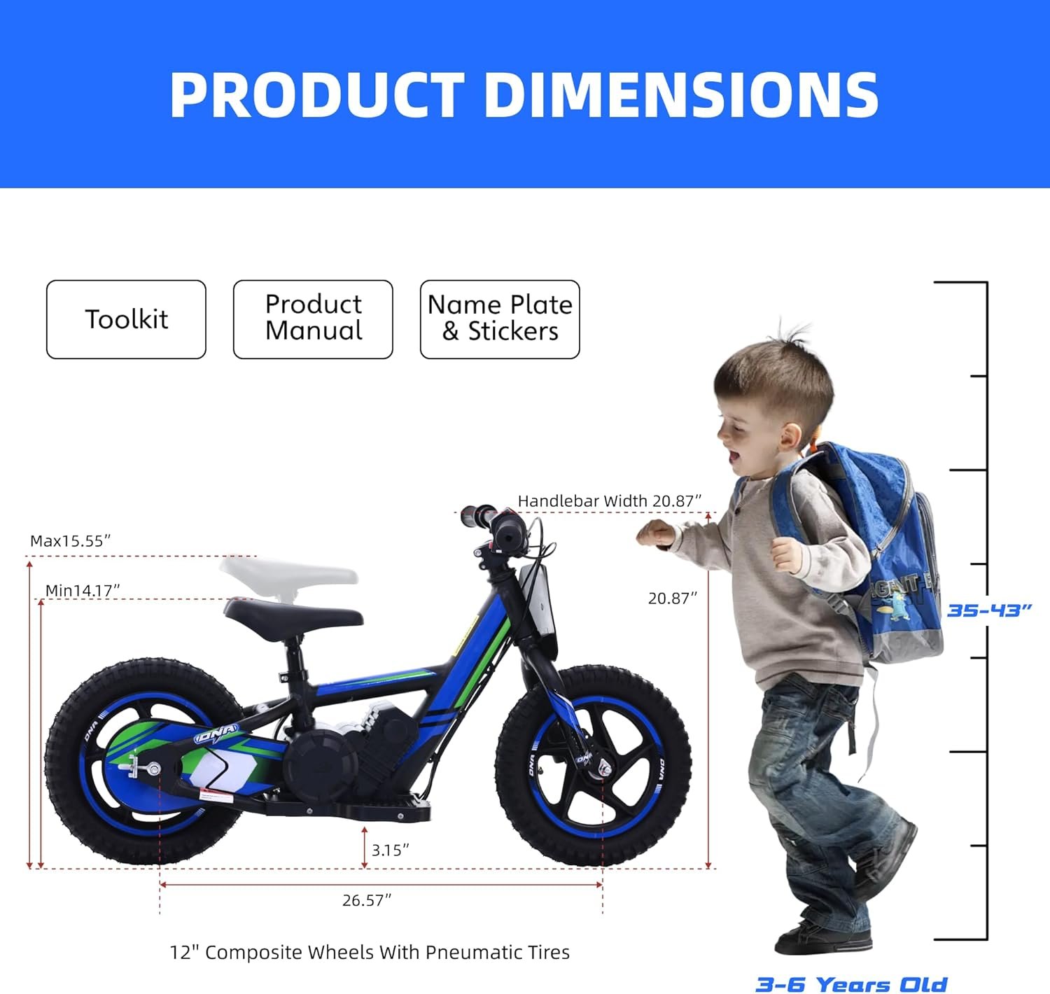 OLALA Electric Dirt Bike for Kids Aged 3-6, 170W Racing Grade Electric Motorcycle, New Aluminum Frame with 2 Power Modes, 24V Detachable Battery, 12IN Knobby Tires
