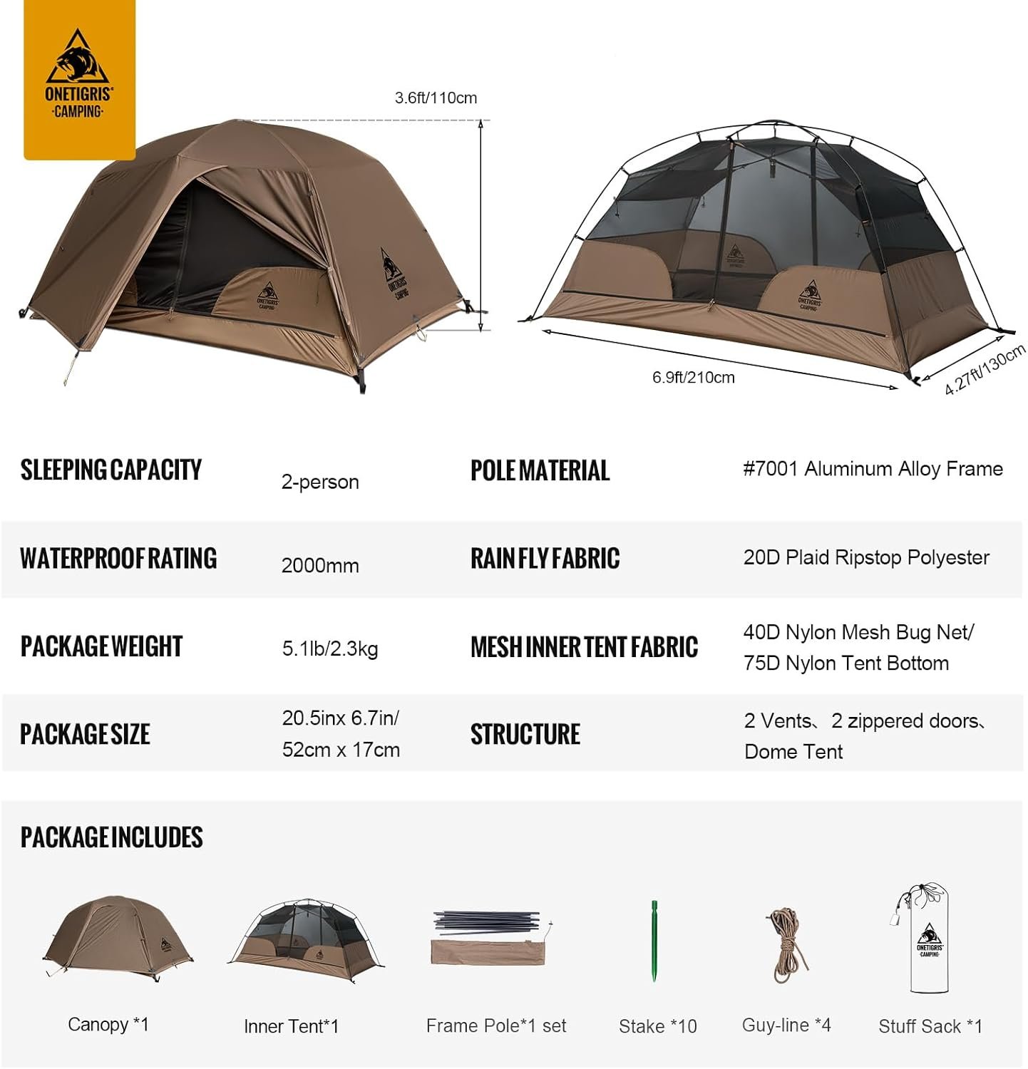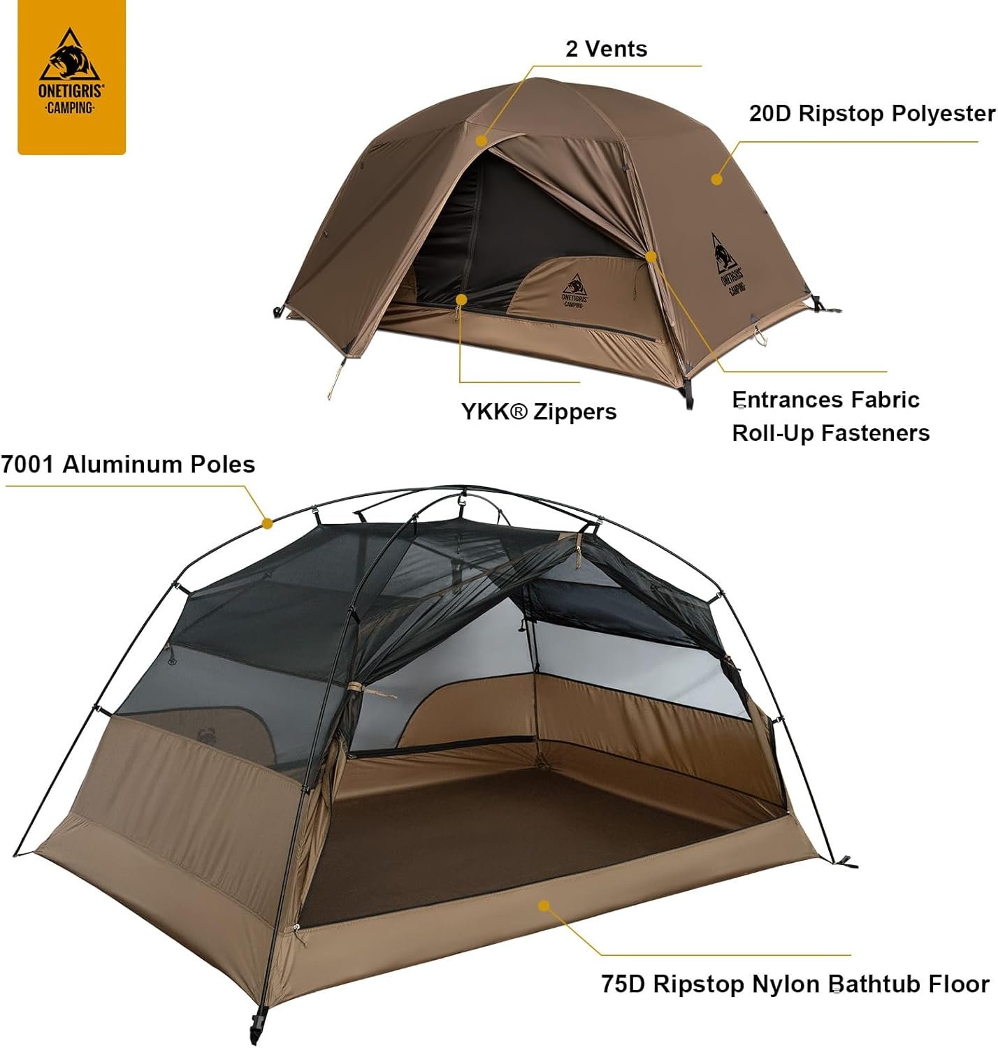 OneTigris COSMITTO 2 Person Backpacking Tent Shelter- Free Standing Lightweight Waterproof 3 Season Camping Tent for Outdoor Hiking Mountaineering