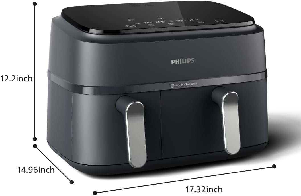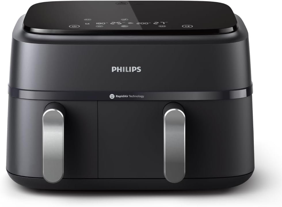 Philips Dual Basket Air Fryer 3000 Series — 8-in-1 functions, 9.5 Quarts, 2 Drawers, Auto-sync Cooking Time, 90% Less Fat, Rapid Air Technology, HomeID Recipe App, Dishwasher Safe, Black (NA351/00)