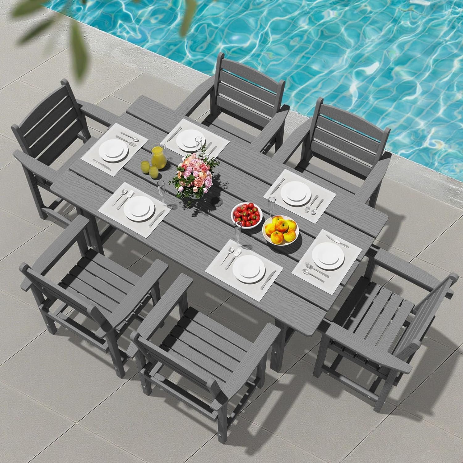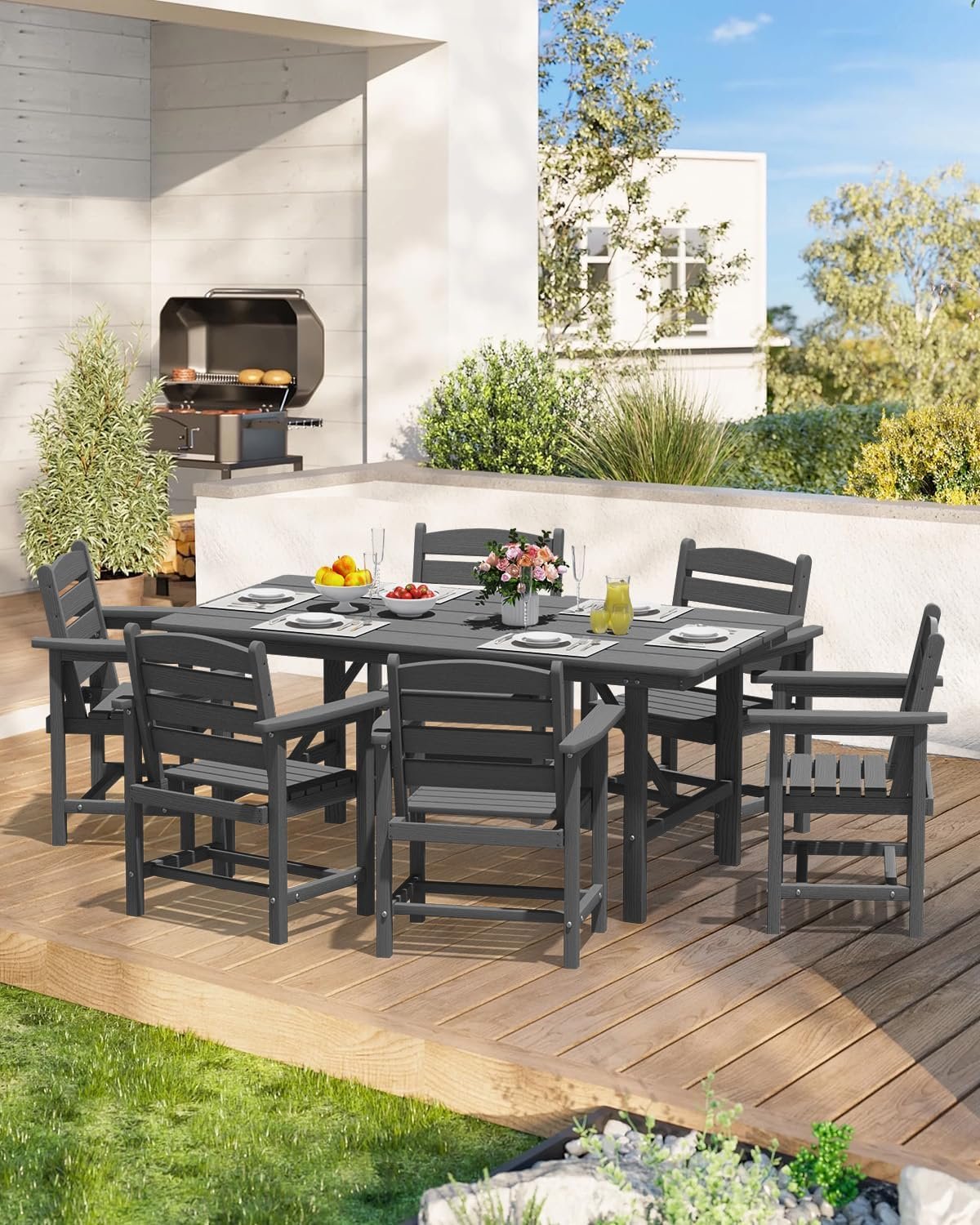 PLUUV Outdoor HDPE Dining Set, 7 Pieces Outdoor Furniture with Large Table& 6 Chairs, All-Weather Patio Dining Set for Lawn, Garden, Backyard, Gray