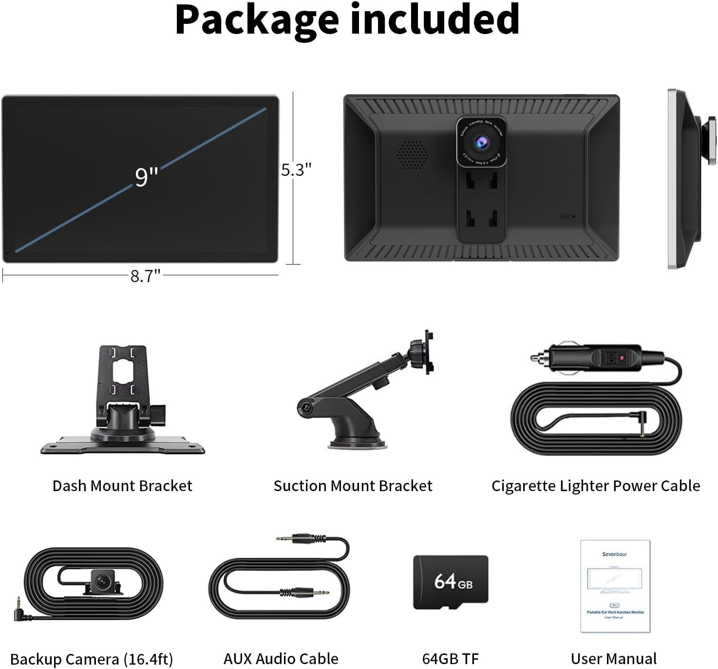Portable Apple Carplay Screen for Car, 9″ Wireless Apple Carplay & Android Auto,4K Dash Cam,1080p Backup Camera DVR,Car Audio Receivers GPS Navigation Mirror Link, Bluetooth,FM, Siri