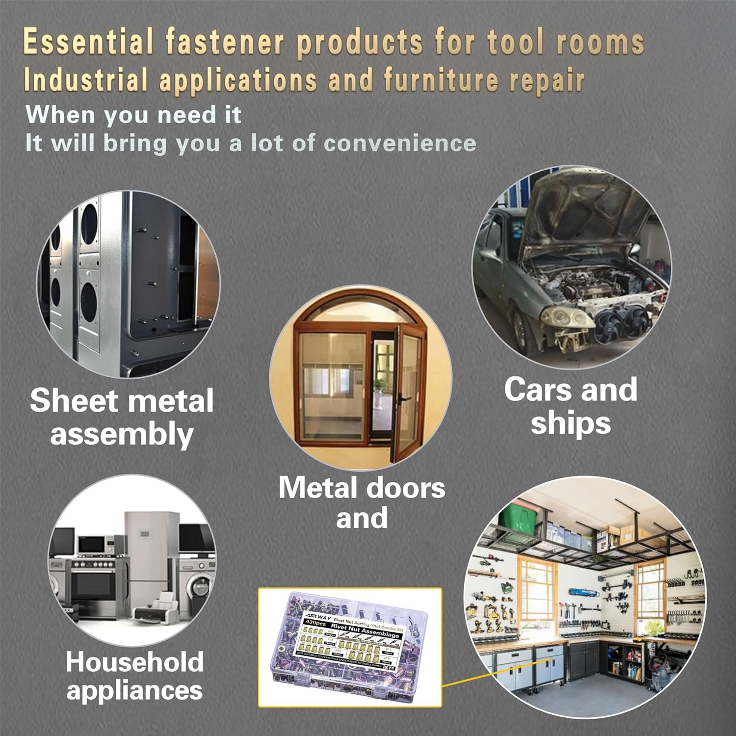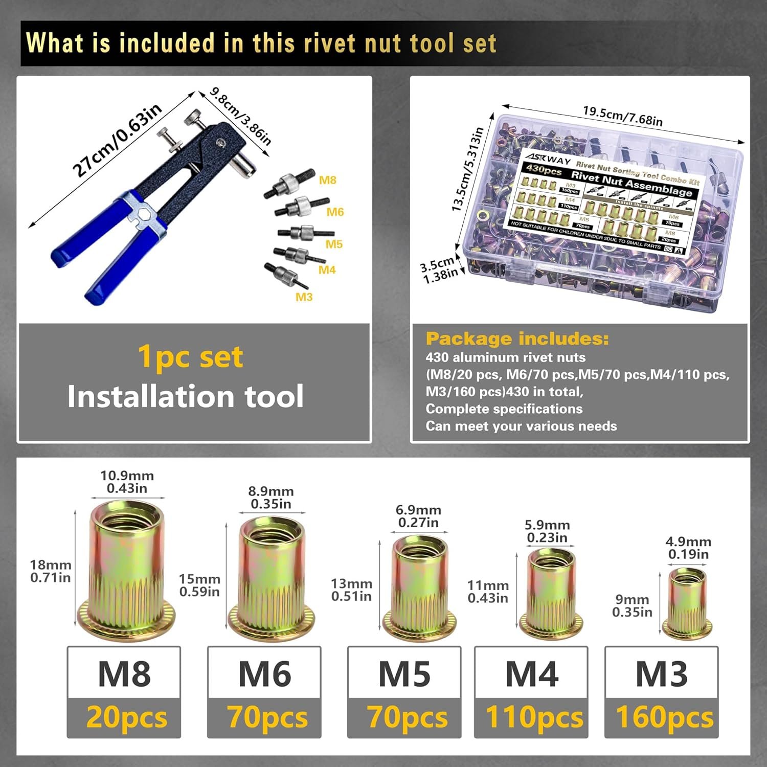 Pressure Rivet Nut Tool Kit, 430Pcs Metric Rivet Nut Combination (M8/M6/M5/M4/M3), Suitable for Furniture, Decoration, Automotive, Marine and Industrial Applications (CarbonSteelRivetNutTool)