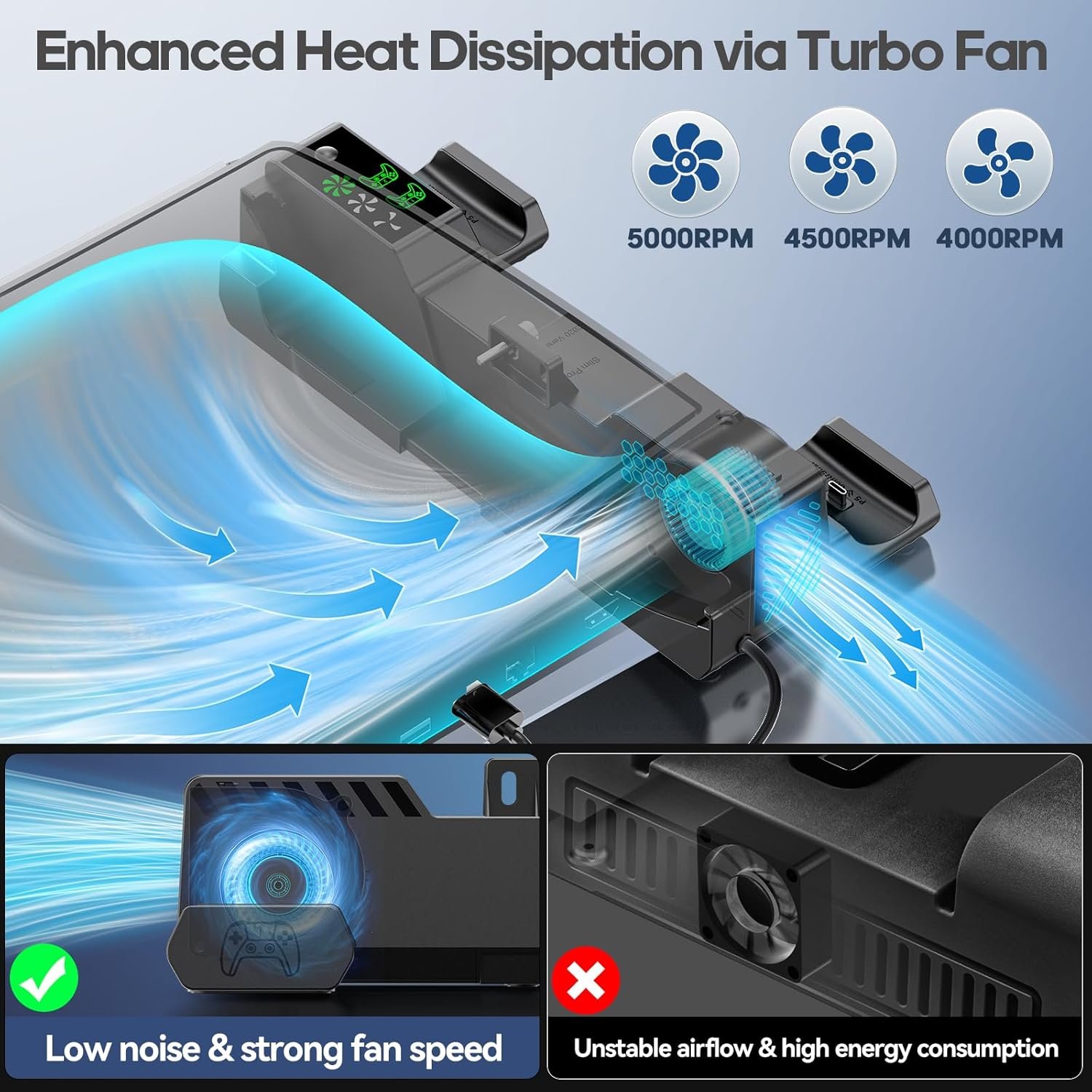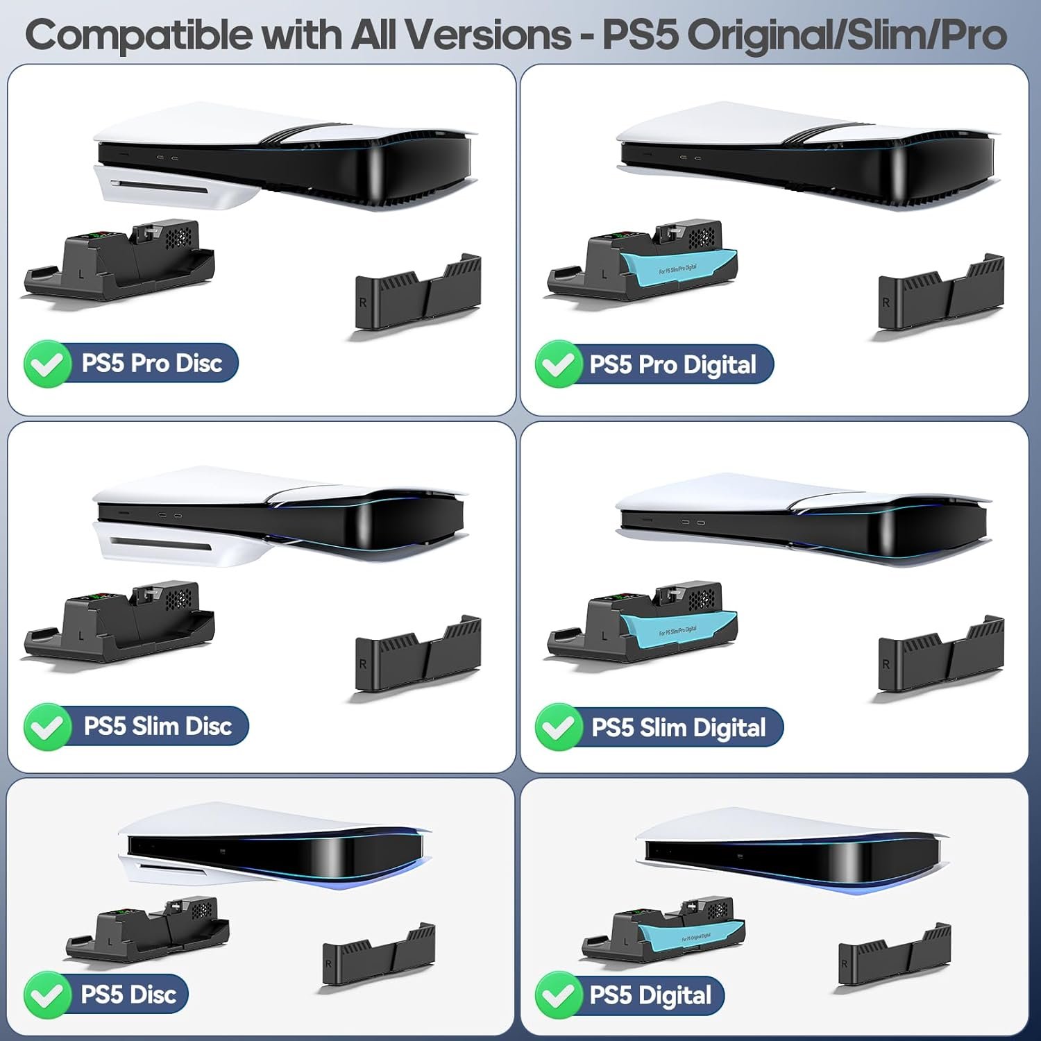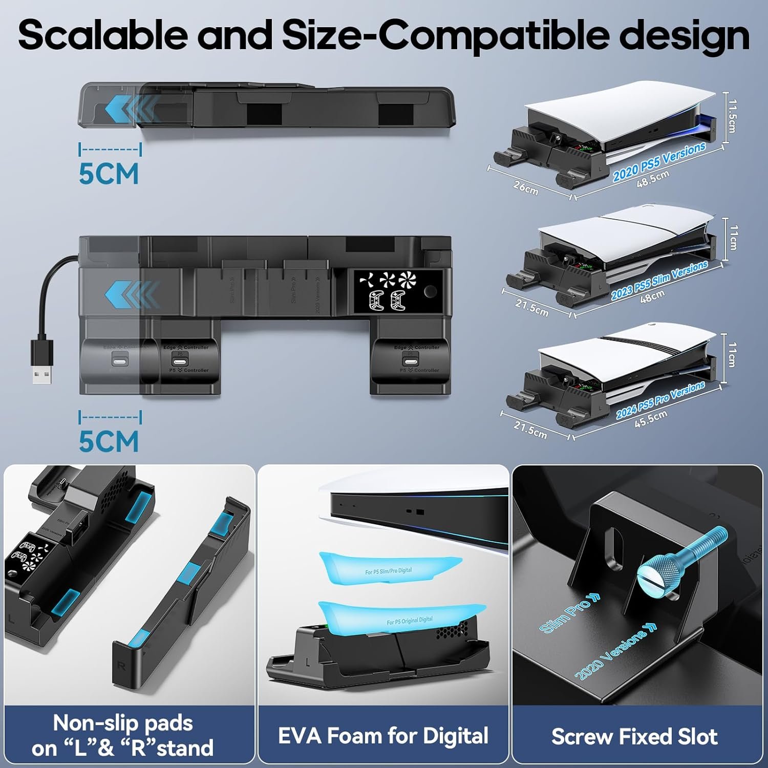 PS5/Slim/Pro Horizontal Stand with Cooling Fan & Charger for Original & Edge Controllers, Scalable Design PS5 Accessories Base with EVA Foams for All PS 5 Disc & Digital, PS 5 Sideways Stand Black