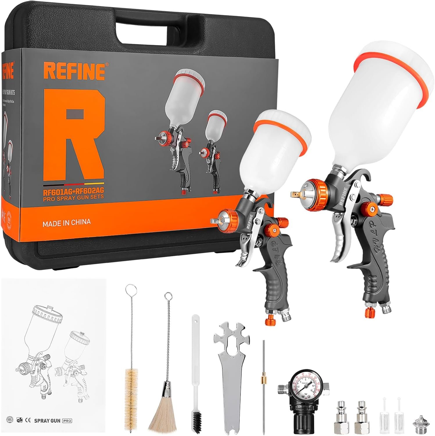 REFINE HVLP Air Gravity Spray Gun Sets, 2-Spray Paint Gun, 1.0mm 100ml & 1.4/1.7mm 600ml Auto Paint Sprayer Gun with Air Regulator for Car Paint, Primer, Topcoat & Touch-Up, Furniture, House Painting.