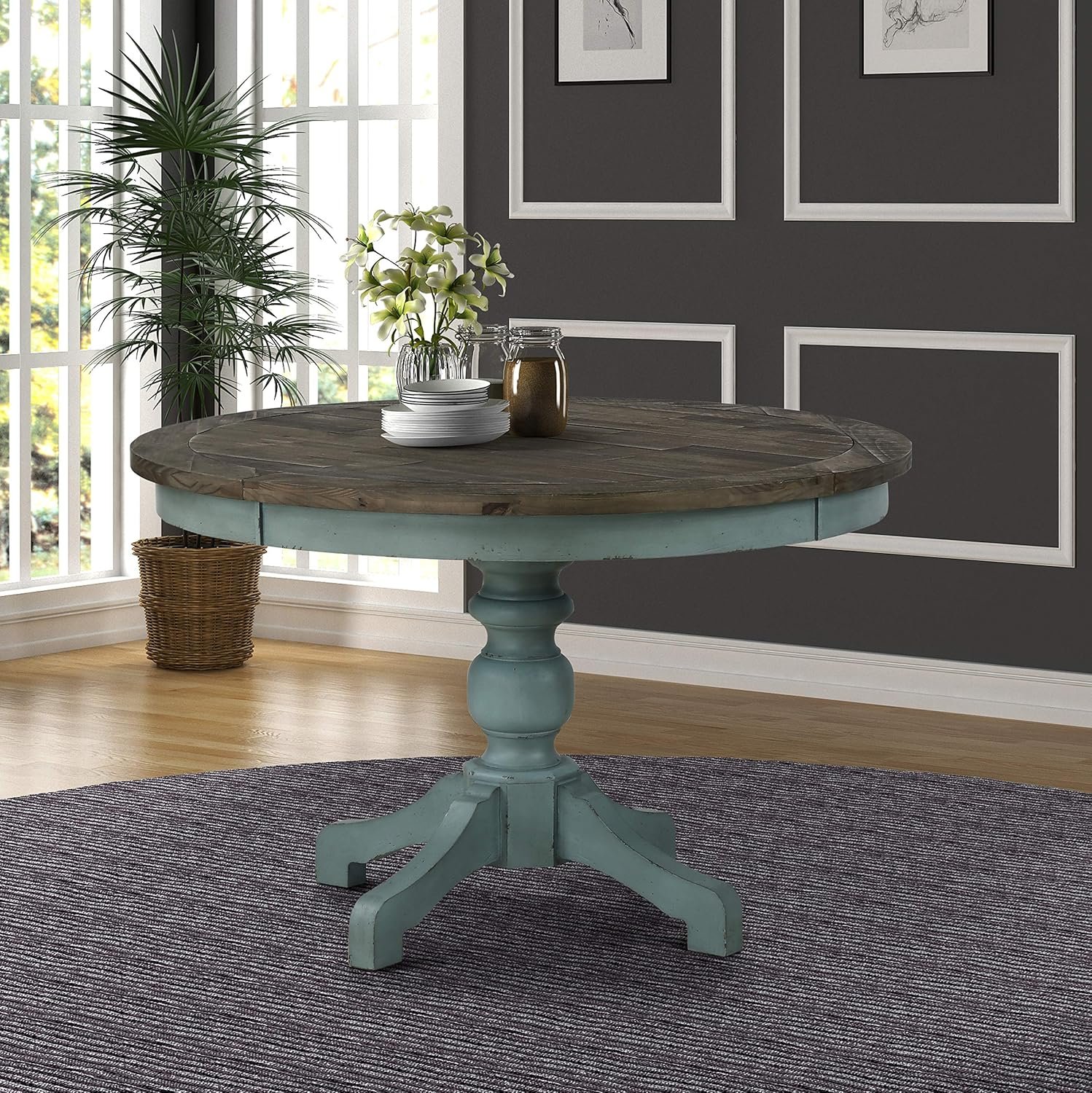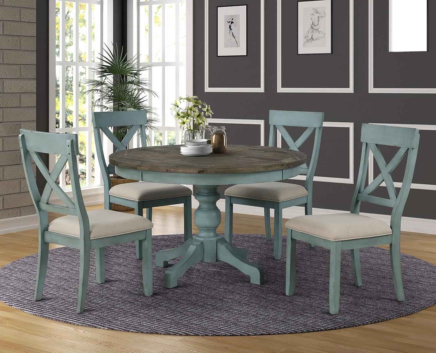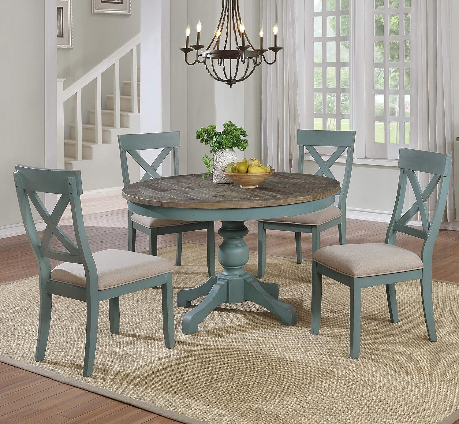 Roundhill Furniture Prato 5-Piece Round Dining Table Set with Cross Back Chairs, Antique Blue and Weathered Walnut