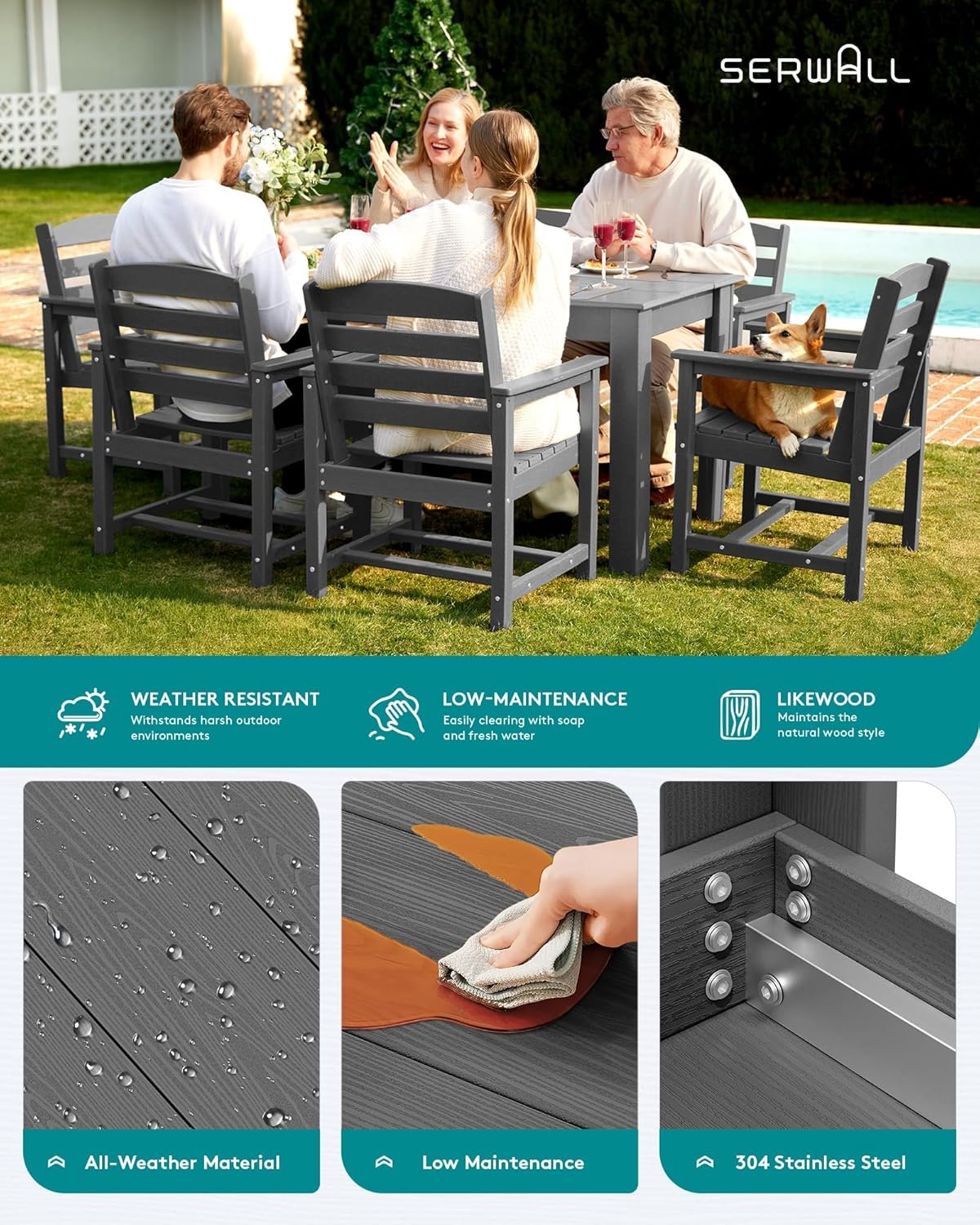 SERWALL Patio Dining Set for 6, Outdoor Dining Sets for 6 Person with 1 Umbrella Hole Cut-Out Rectangular Table and 6 Chairs, HDPE Dining Sets for Garden, Backyard, Poolside, Gray