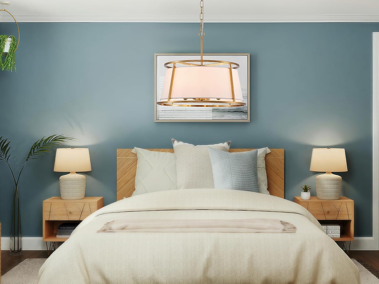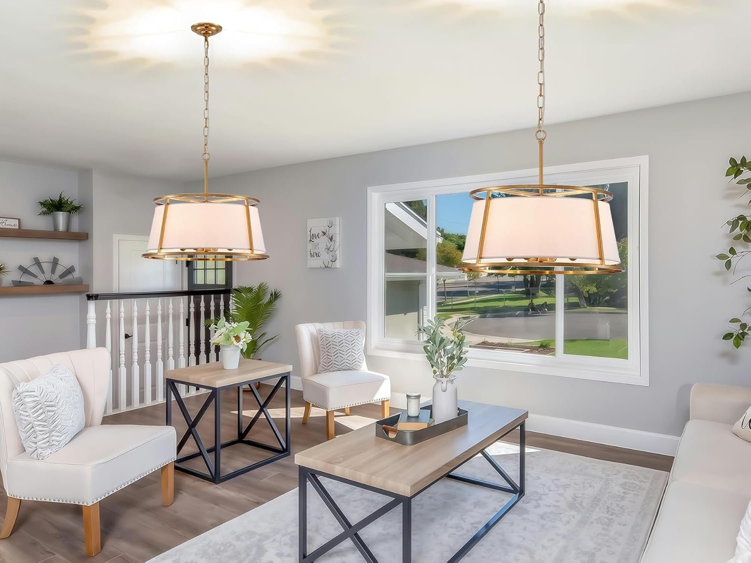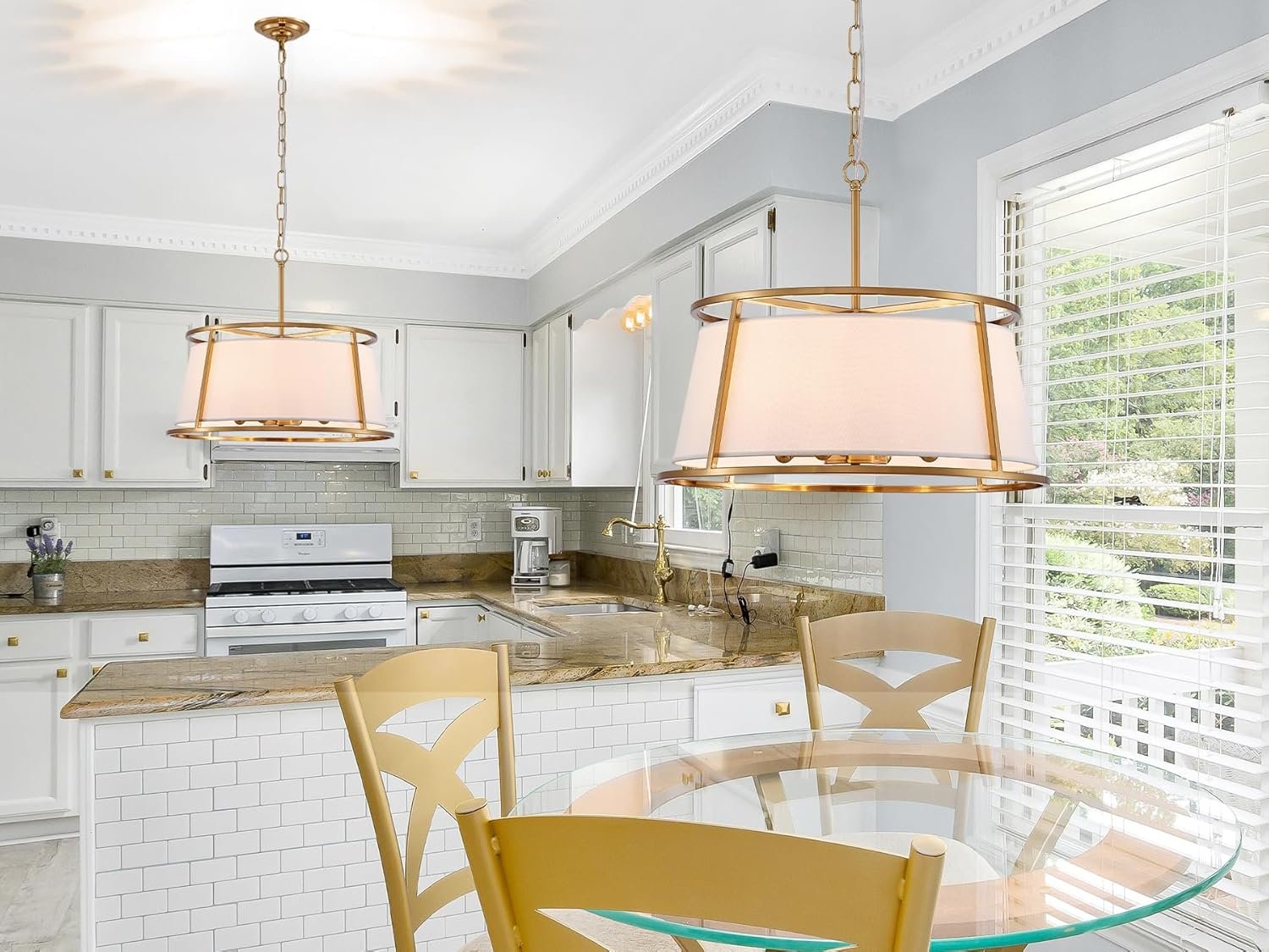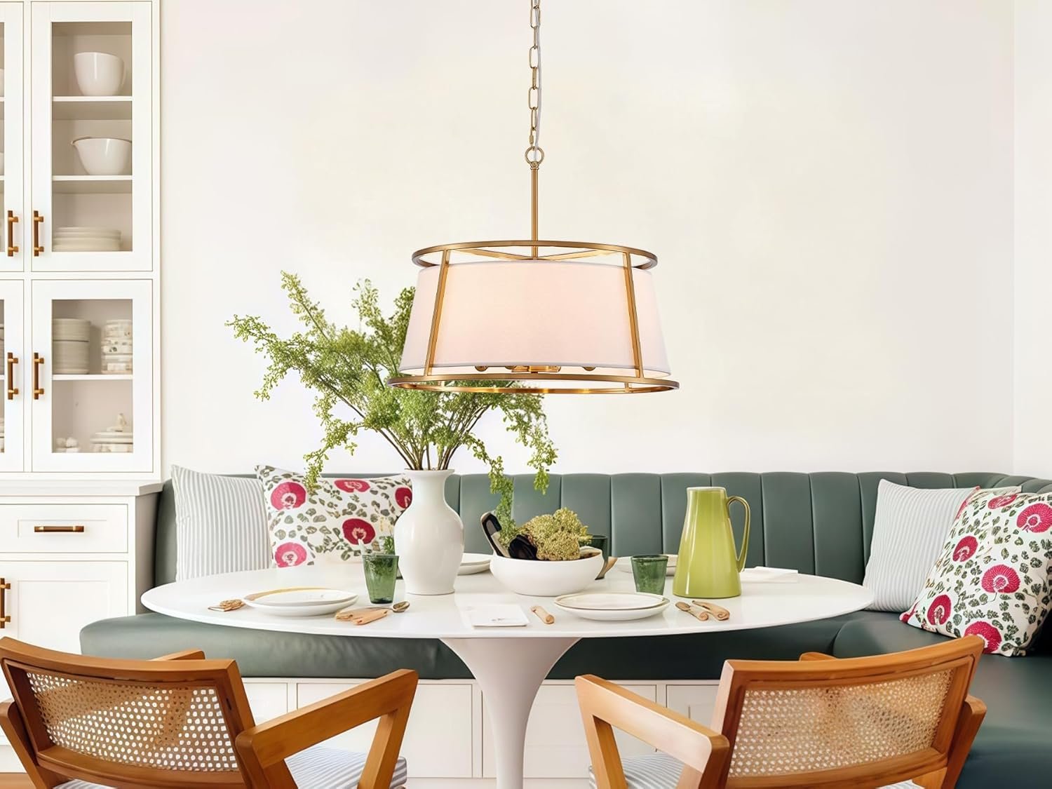 Shrine Lighting Drum Chandeliers, Modern Style, Perfect Pendant Light Fixture for Dining Room, Living Room, D20” x H9”, Adjustable Chains 59”, E12*4 Sockets, White Lampshade & Brass Finish Frame