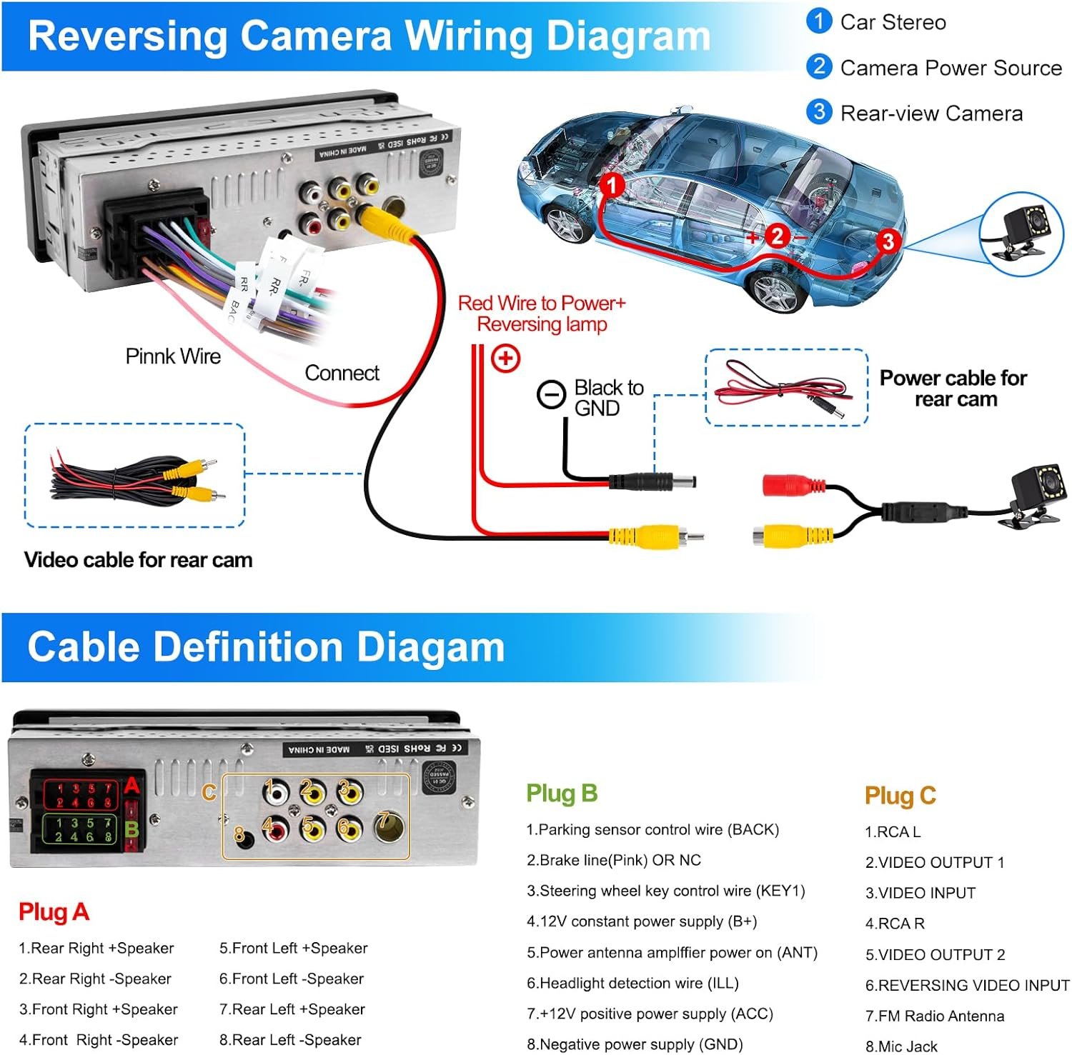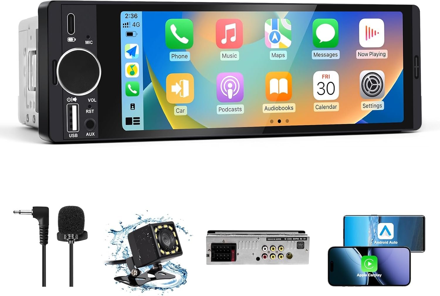 Single Din Car Stereo with Apple CarPlay & Android Auto, 6.36 Inch HD Touch CarPlay Screen, Backup Cam,Bluetooth, USB Type-C, SWC, EQ, FM Radio (with External Mic)