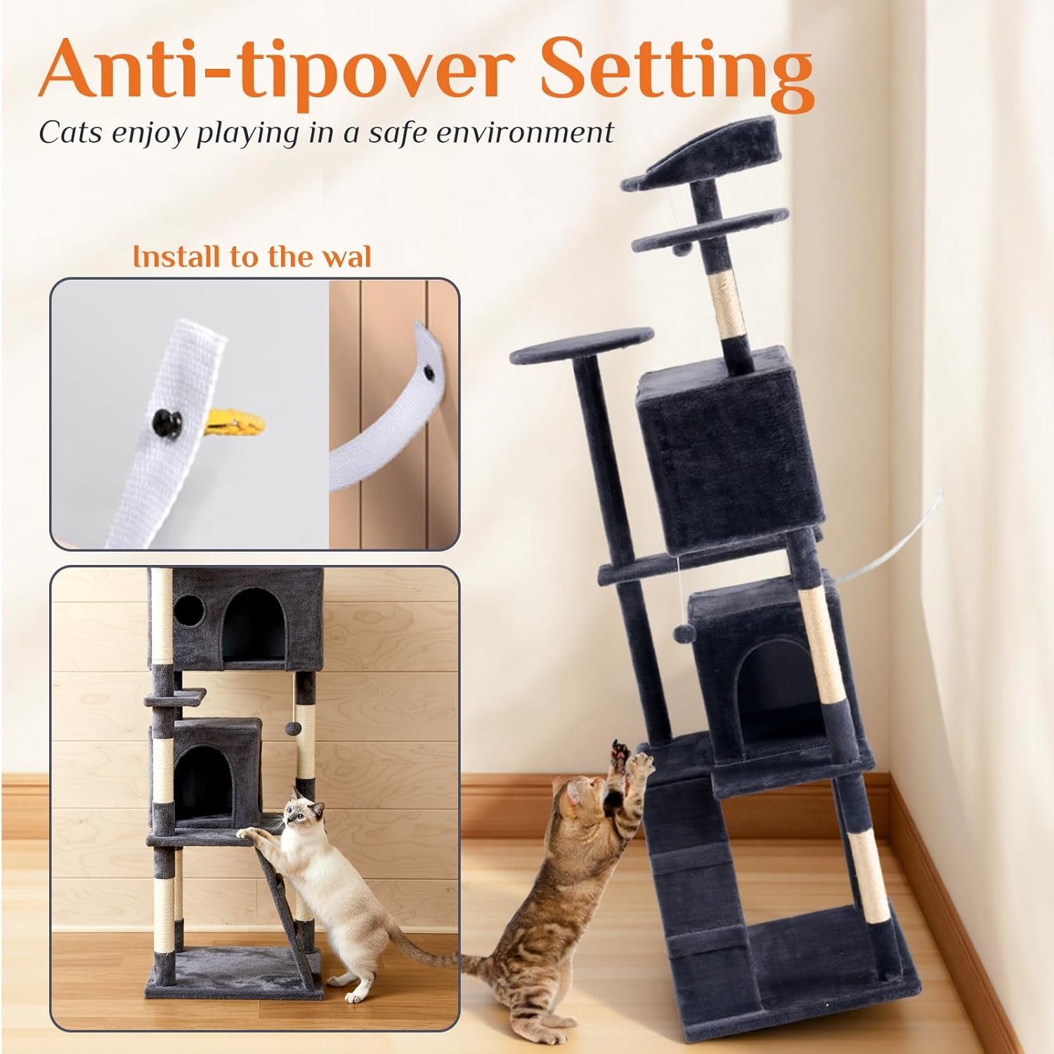 Sweetcrispy 70″ Large Cat Tree Tower, Cat Tree for Large Cats, Multi-Level with Scratching Post, Cozy Fun Cat Jumping Platform Space, Grey