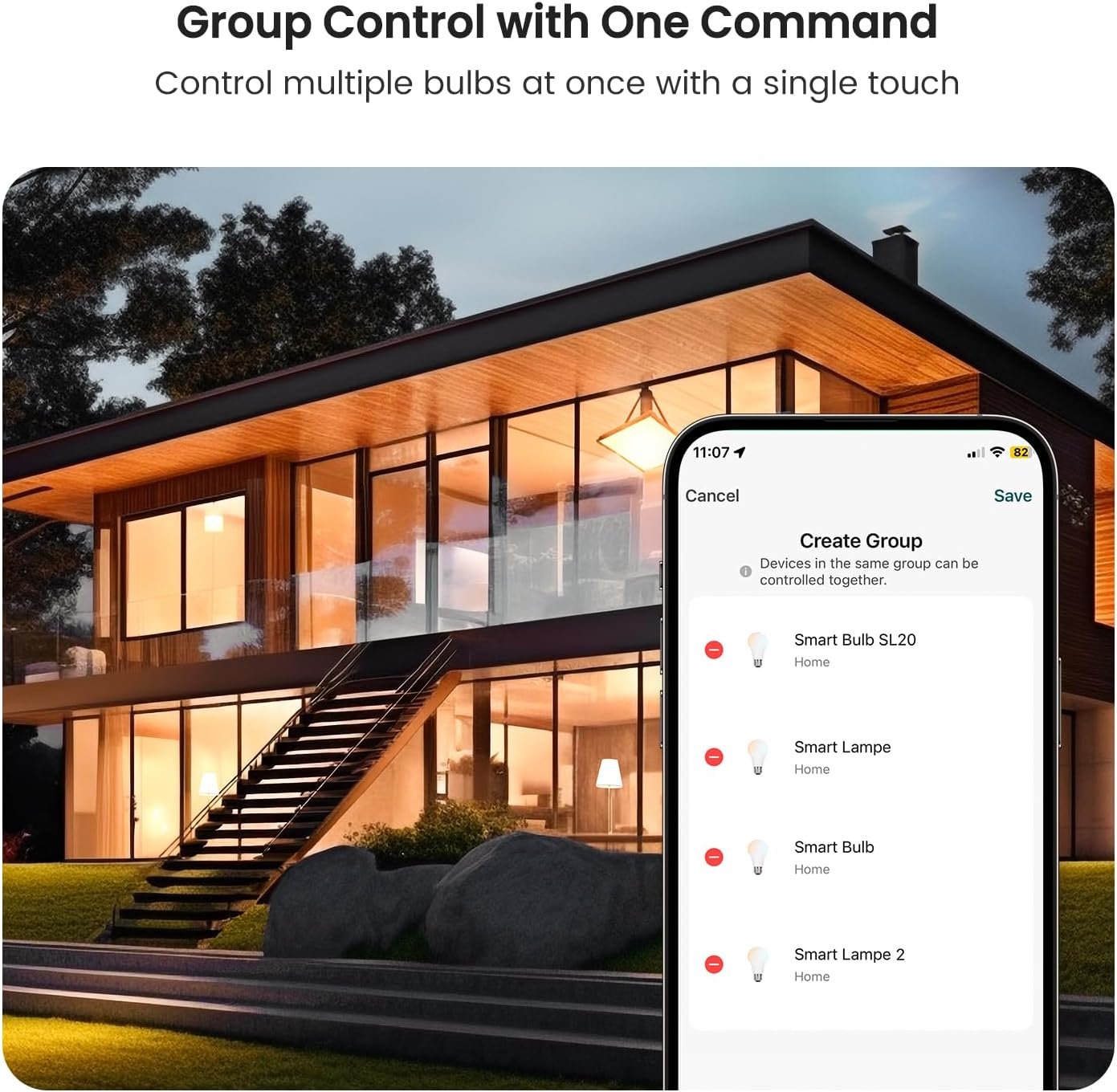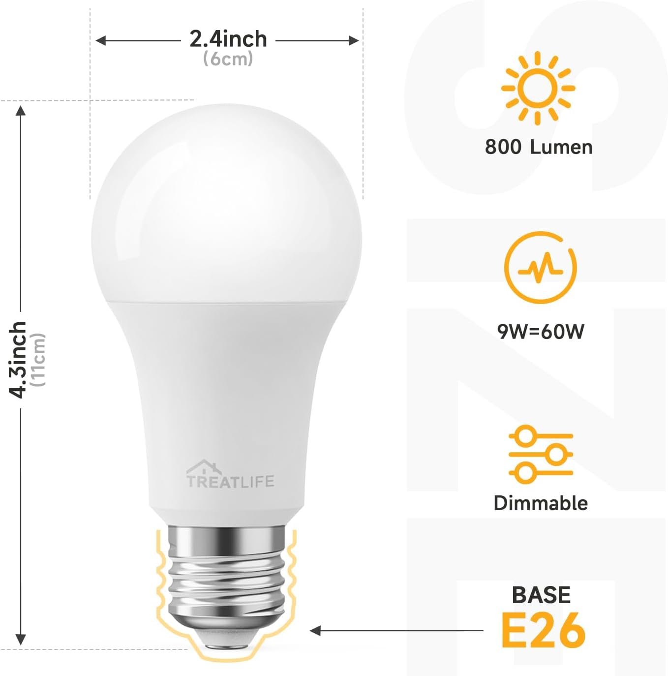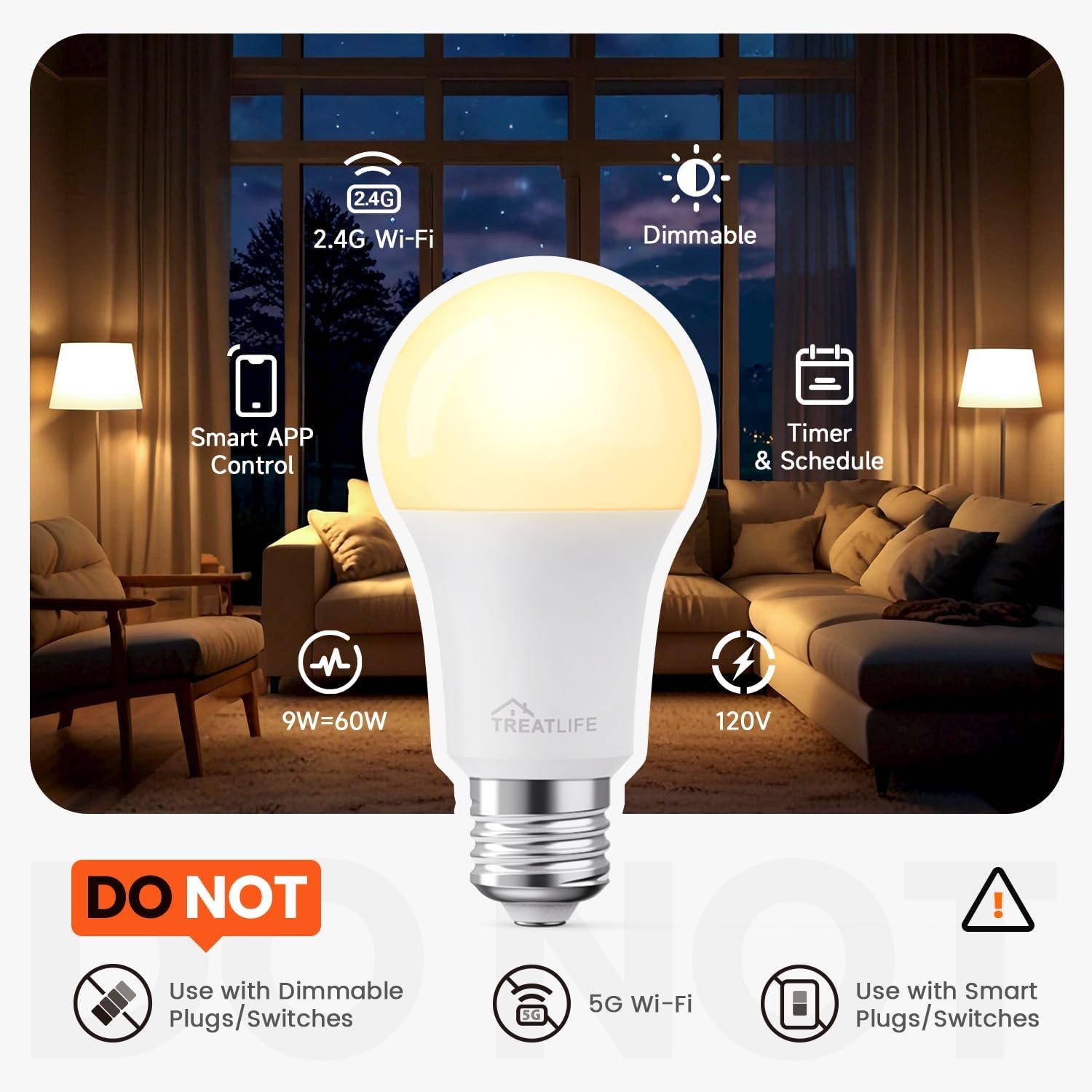TREATLIFE Smart Light Bulbs 4Pack, 2.4GHz WiFi Smart Bulb, 2500K-6500K Tunable White Dimmable LED Light Bulb Compatible with Alexa and Google Home, 800LM, E26 A19 9W, No Hub Required