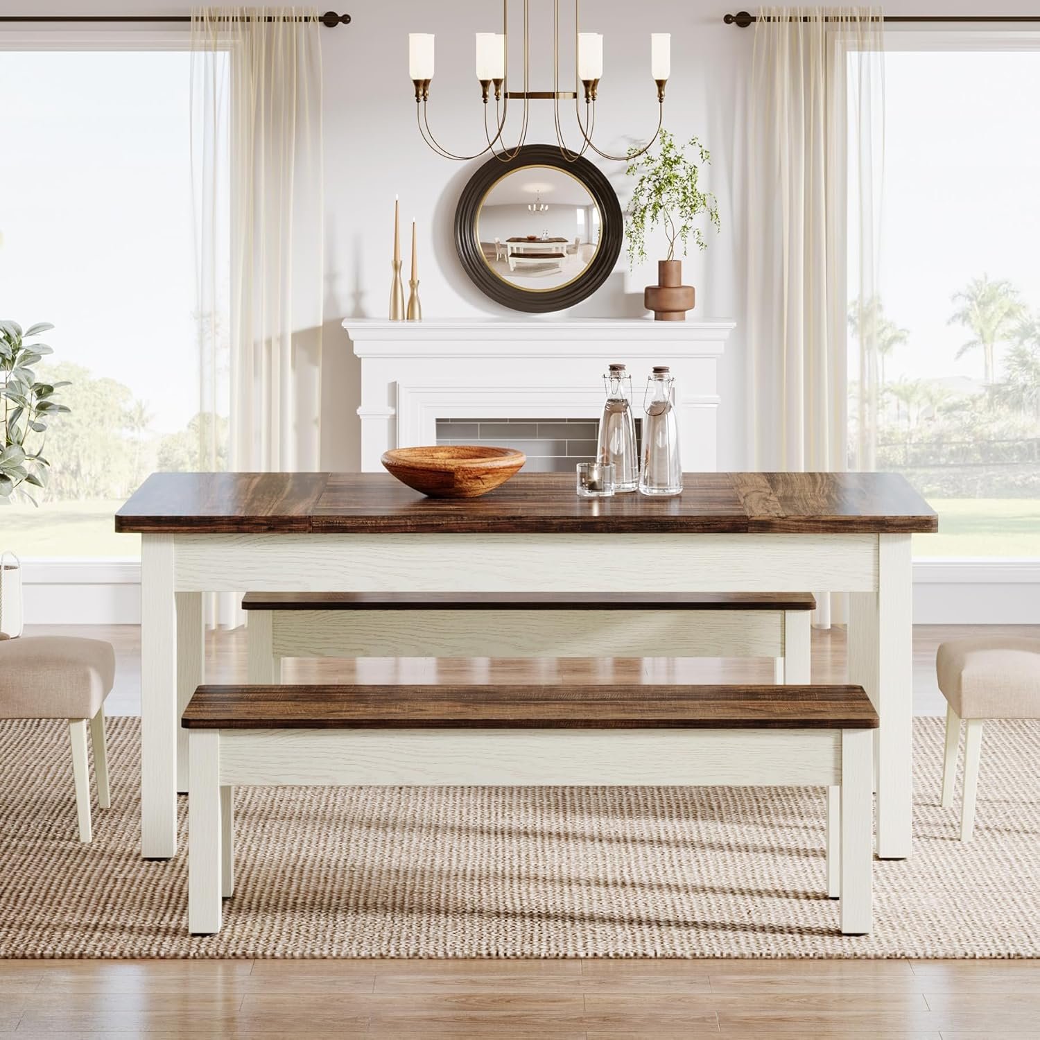 Tribesigns Farmhouse Kitchen Table Set for 4-6, 55-Inch Wooden Dining Table with 2 Benches, Space Saving 3 Pieces Heavy Duty Dinette for Dining Room, Kitchen, Small Space