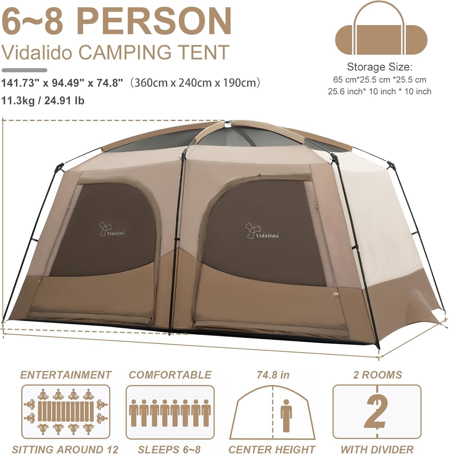 Vidalido Tents,6-8 Person Camping Tent with Extended Vestibule,2 Room Weather Resistant Family Tents,Easy Install Waterproof Outdoor Tent for Backpacking and Camping Hiking