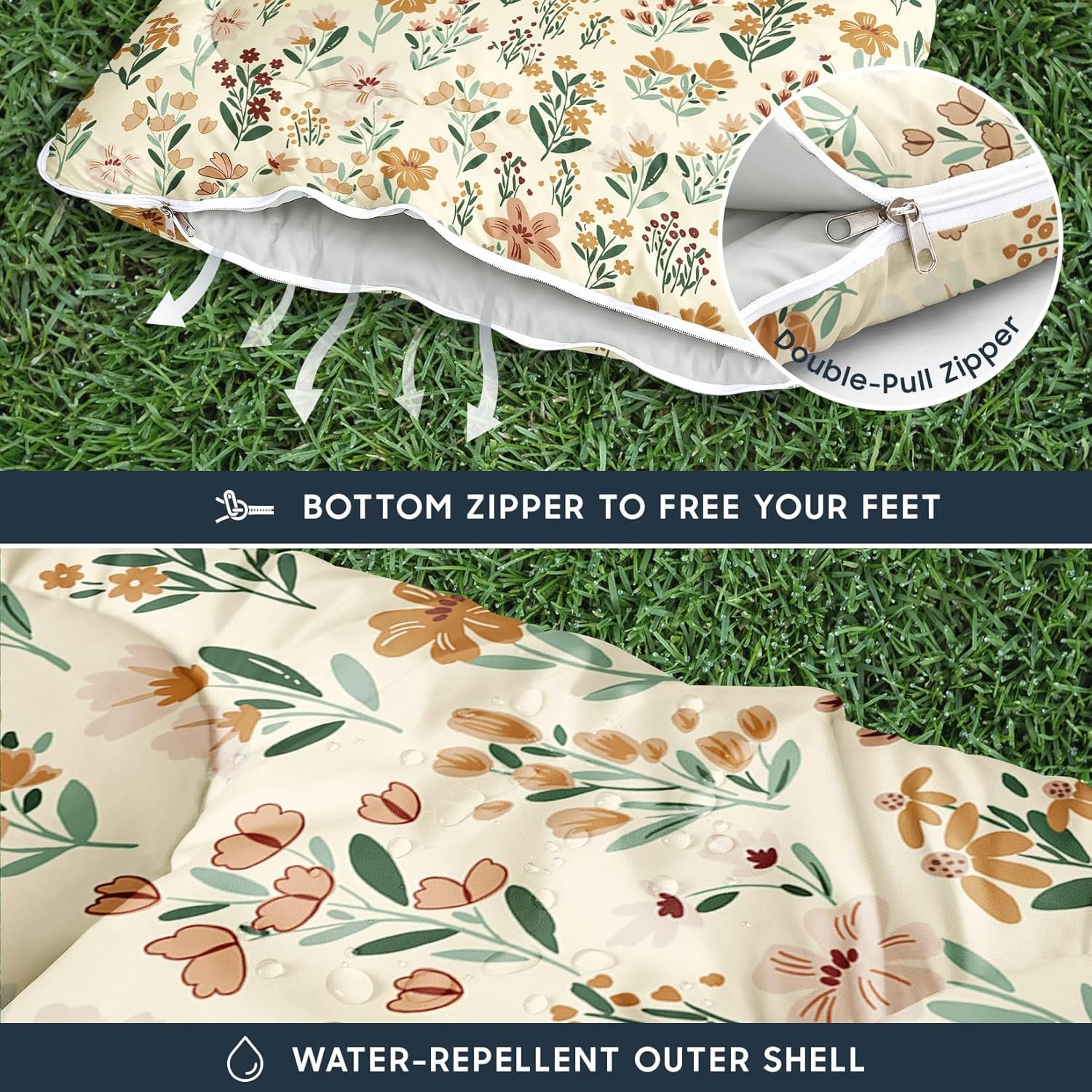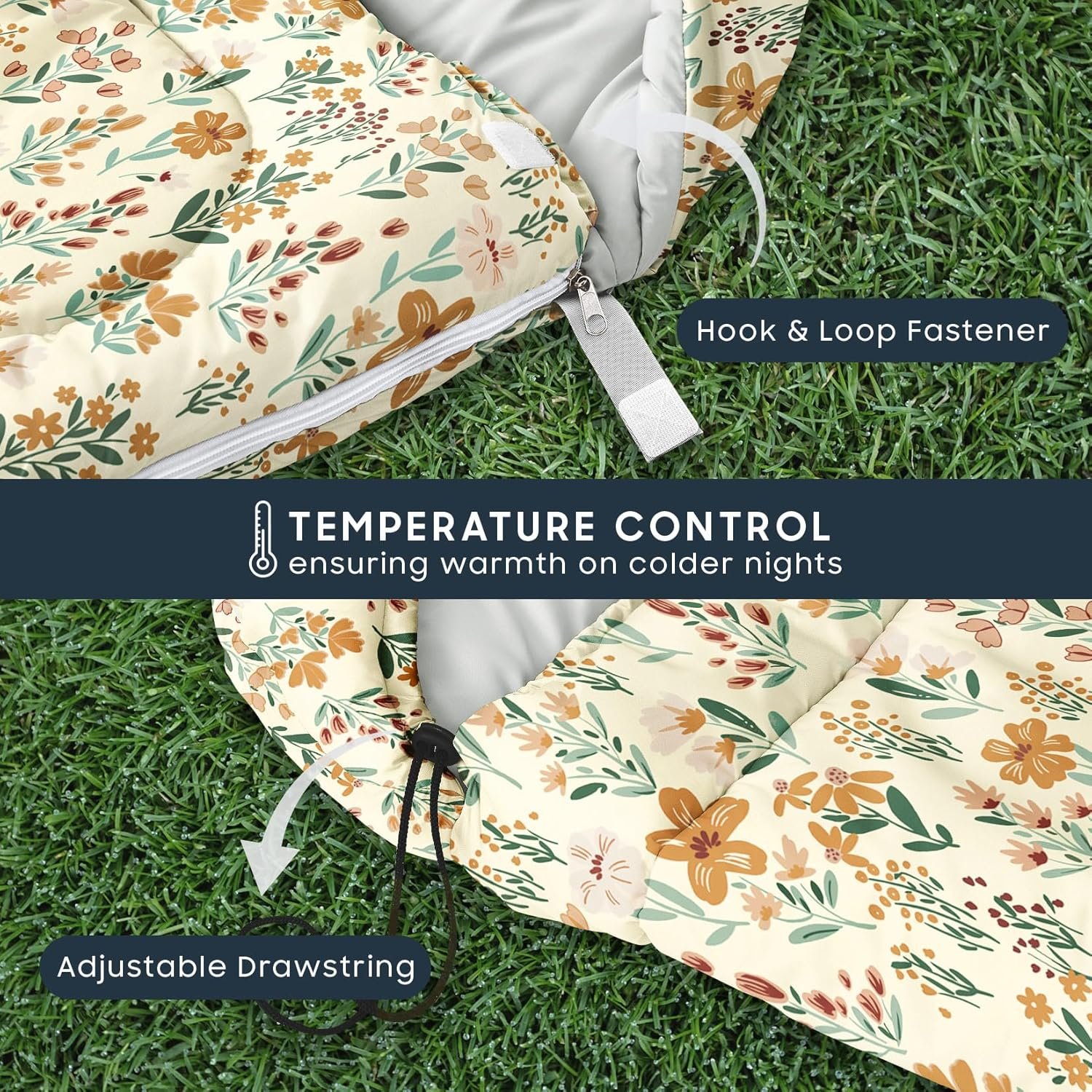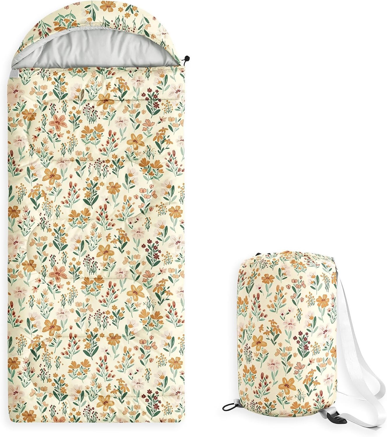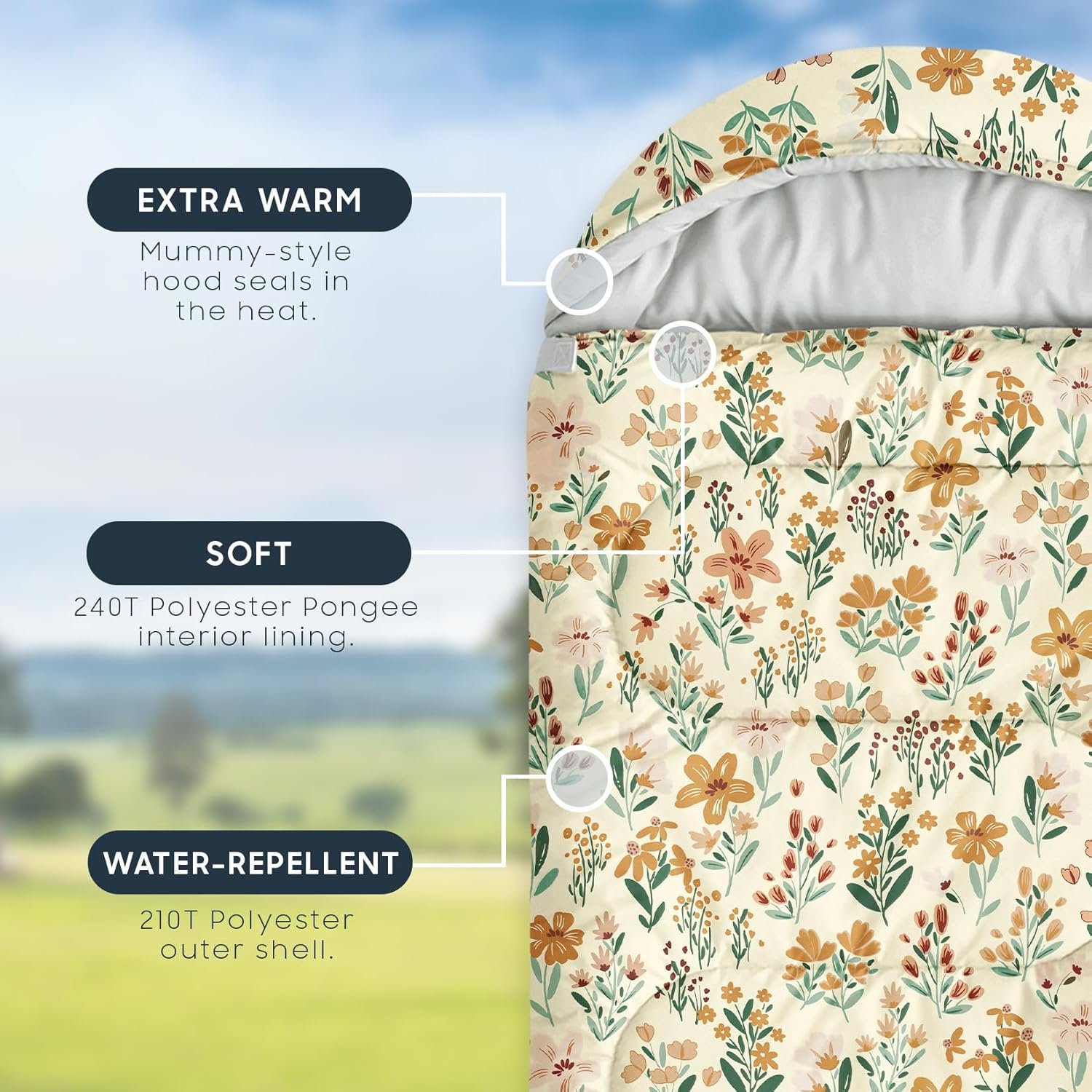 Wake In Cloud – Kids Sleeping Bag for Girls Toddlers, Camping in Warm Cold Weather, Backpacking Lightweight Compact Outdoor Liner for 3 Seasons Summer Spring Fall, Flowers Orange Cream