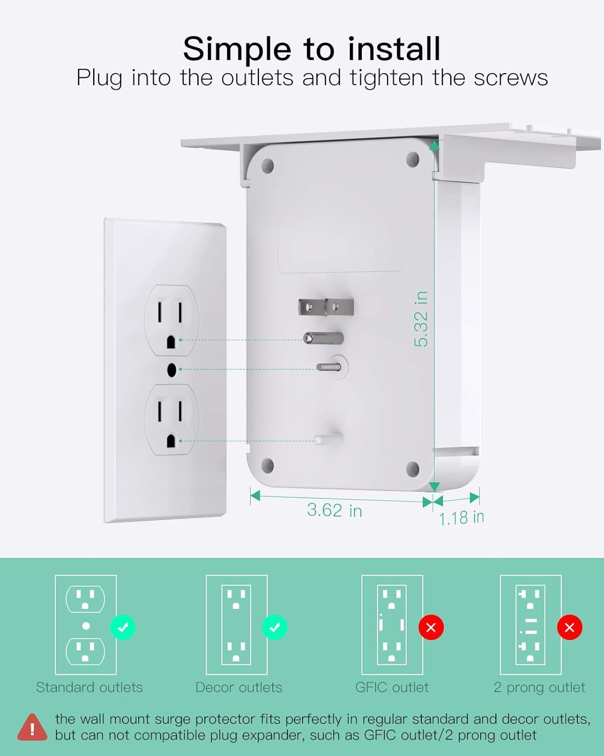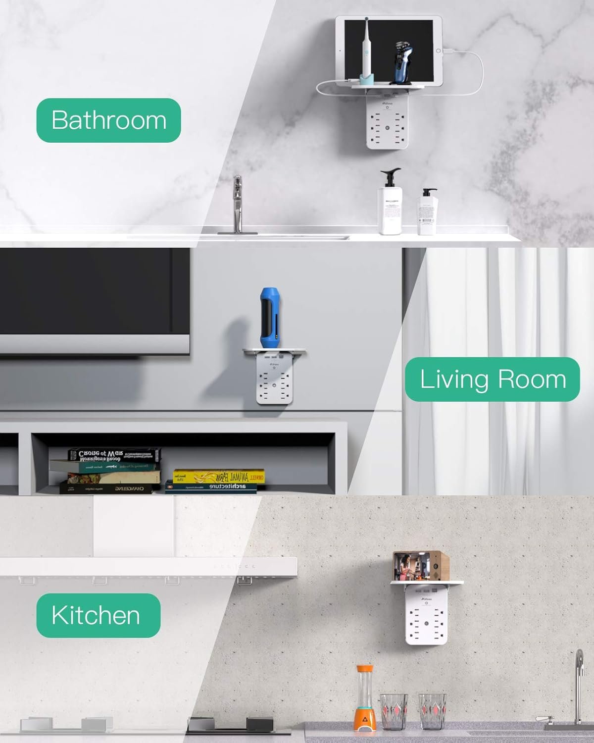 Wall Outlet Extender with Surge Protector, 6 AC Outlets, Shelf, 2 USB & USB C Charging Ports – Home & Dorm Plug Expander
