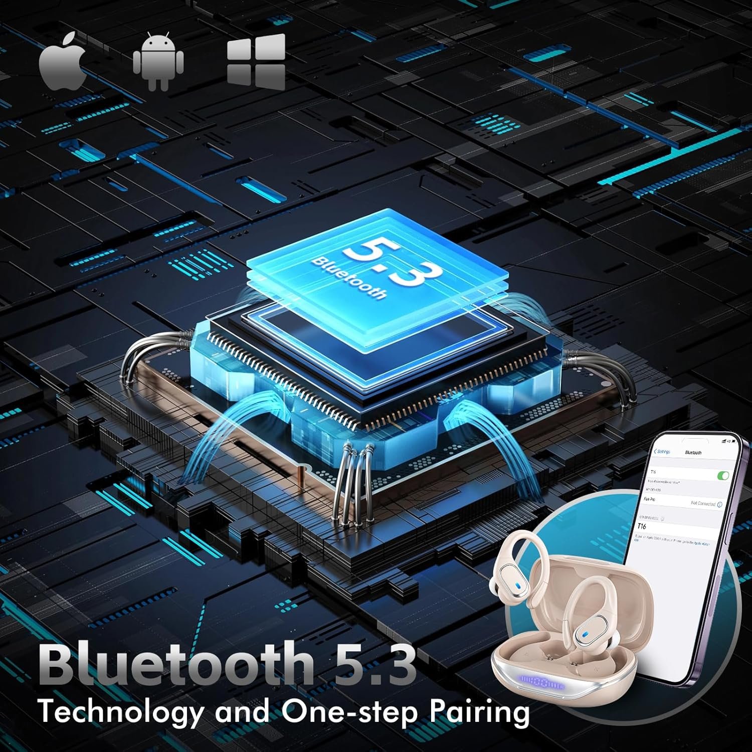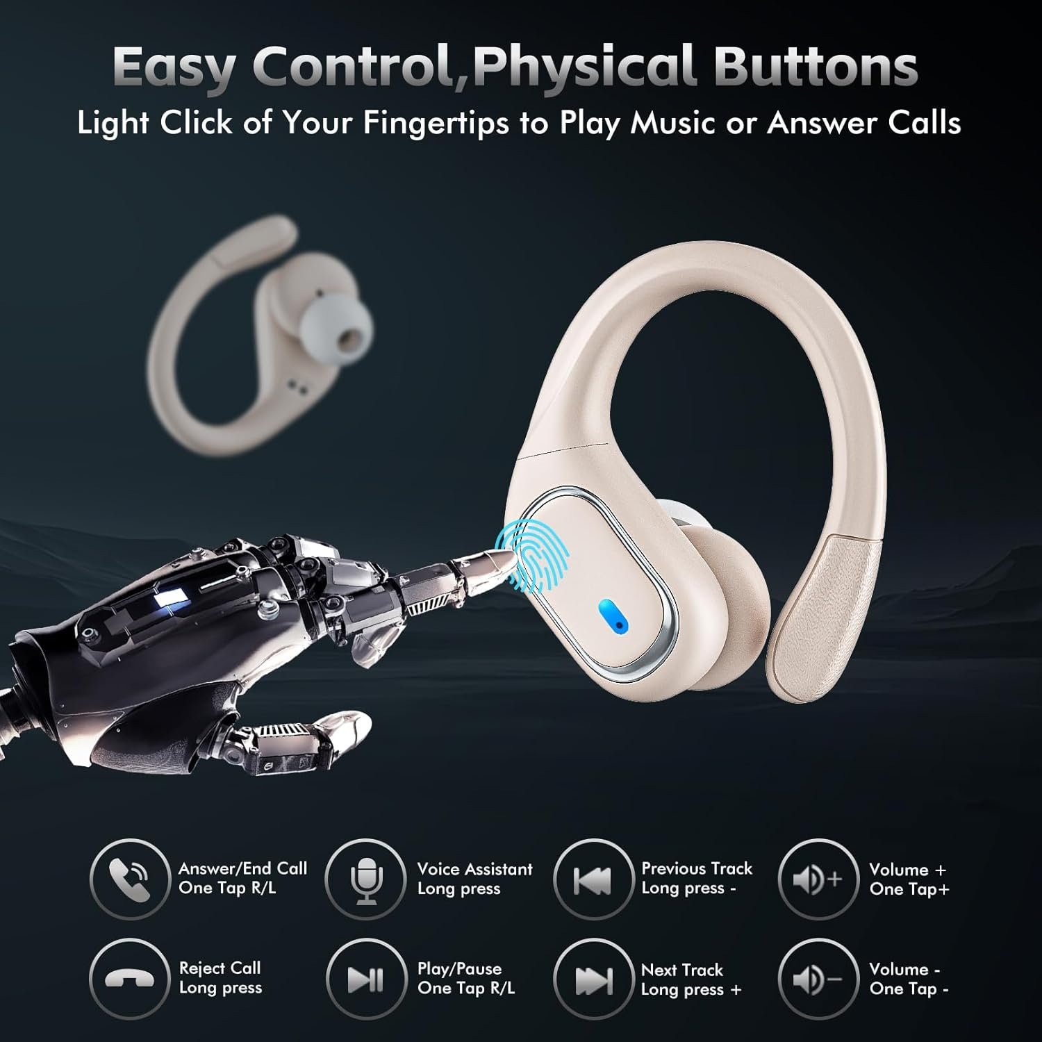 Wireless Earbuds Bluetooth 5.3 Headphones with 80H Playback, IPX7 Waterproof Over Ear Buds with LED Power Display for Sports Running Workouts (Khaki)