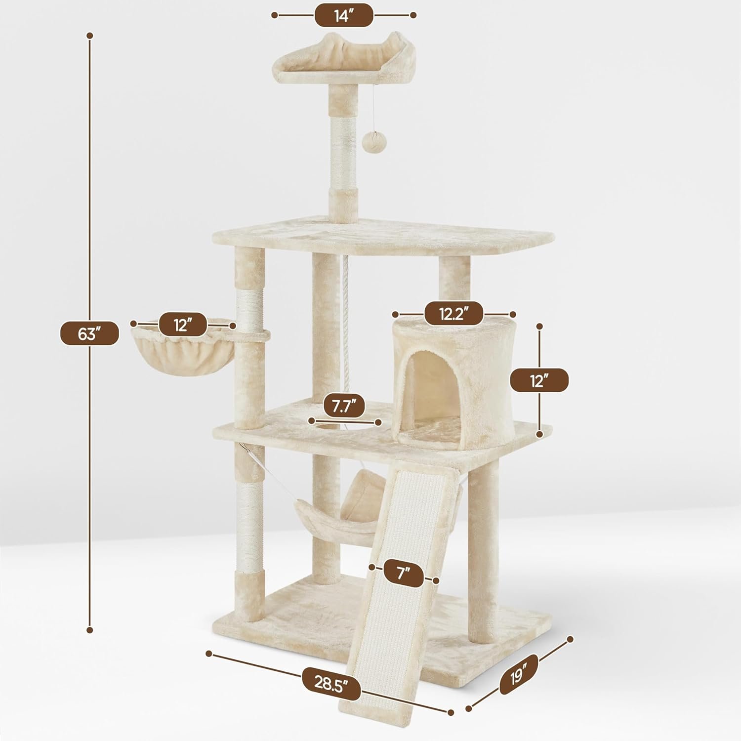 Yaheetech Large Multi-Level Cat Tree, 63 Inches Tall with Sisal-Covered Scratching Posts, Condo, Hammock, Dangling Ball, and Extended Platform for Cats to Play and Sleep