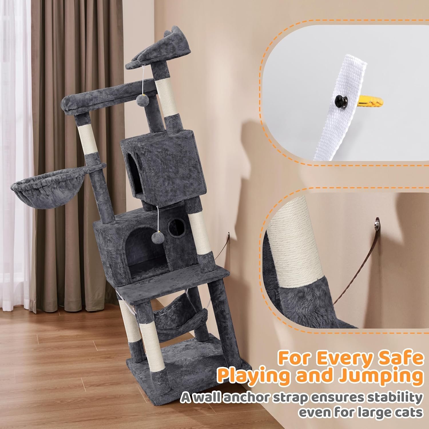 Yaheetech 64.5in Extra Large Multi-Level Cat Tree Kittens Play House Condo with Platform, Perch Hammock & Scratching Posts, Dark Gray