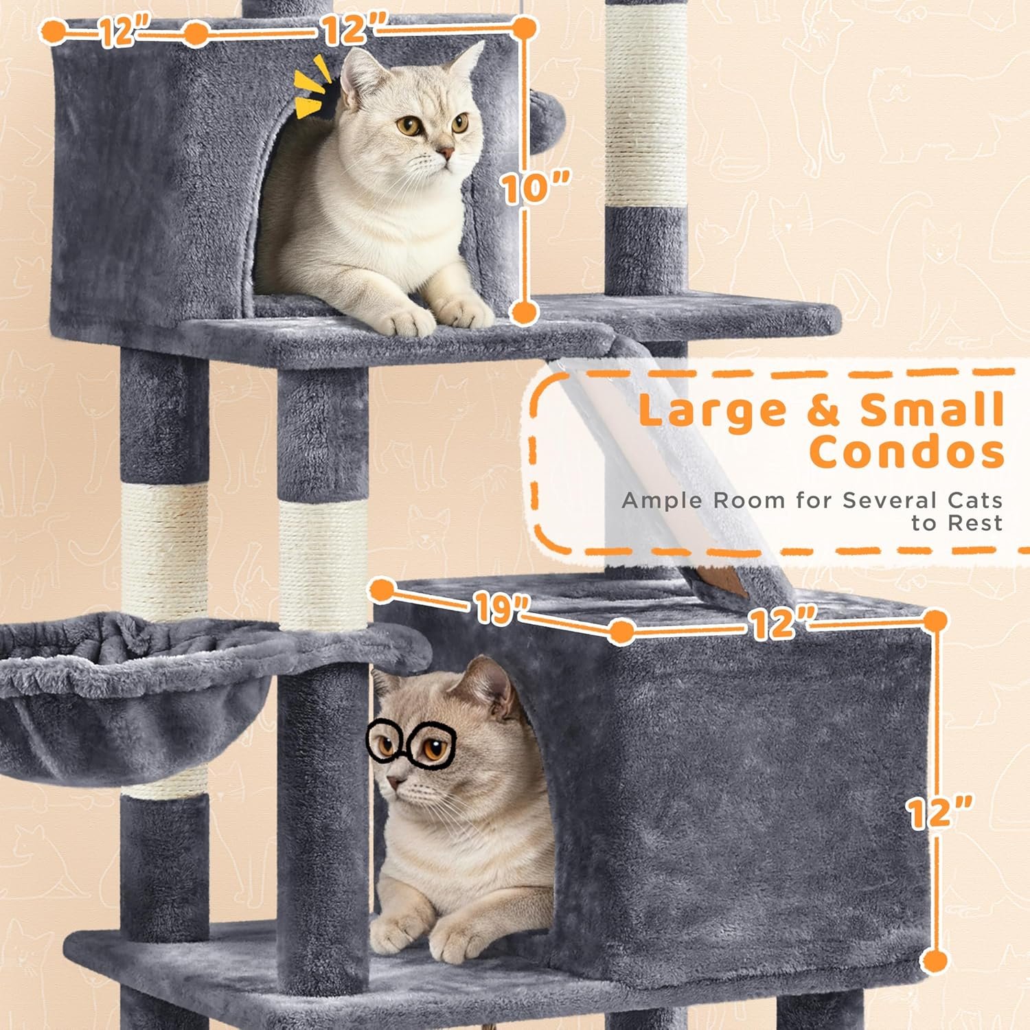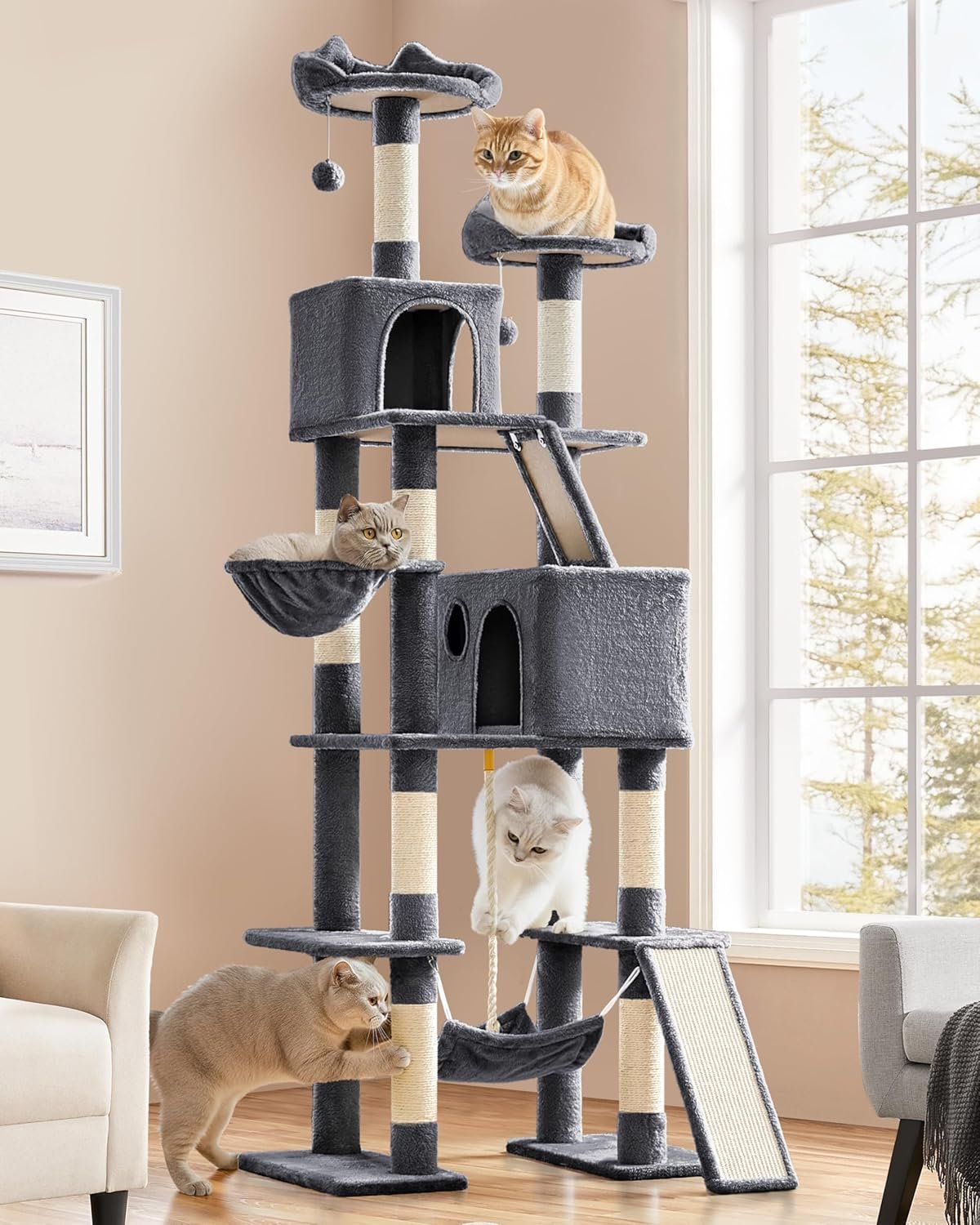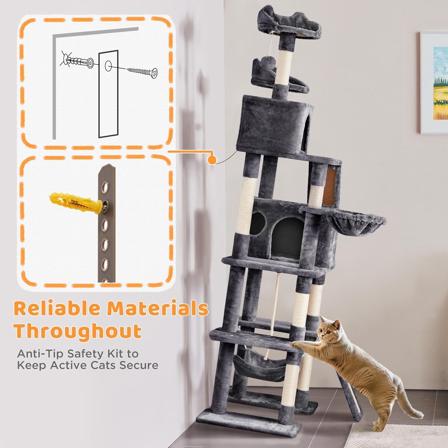 Yaheetech Cat Tree, 82.5in Large Tower w/Hammock, 2 Kitty-Ear Perches, 2 Cozy Condos, Scratching Posts, Basket, Furniture for Large Cats, Kittens, Dark Gray