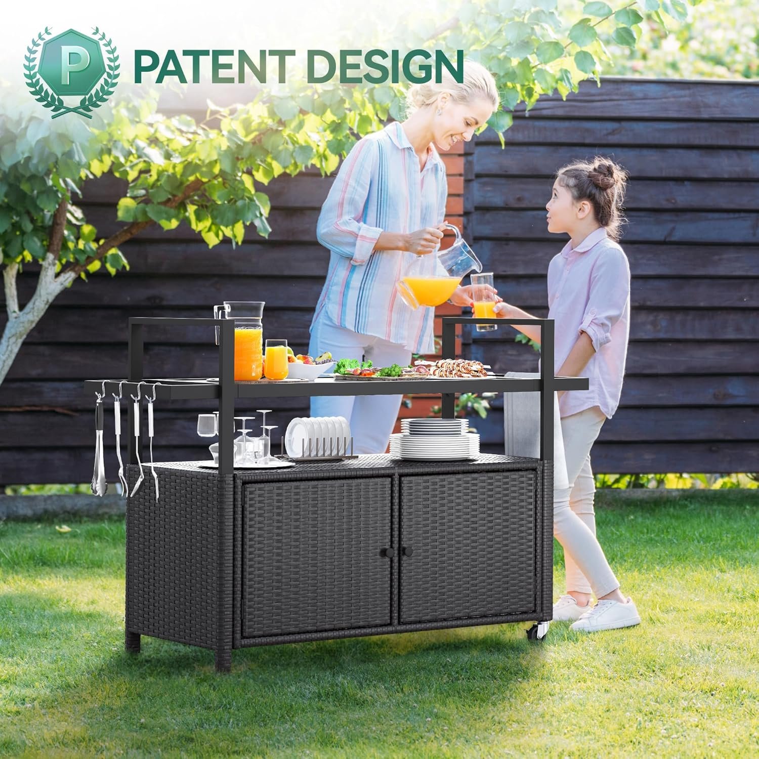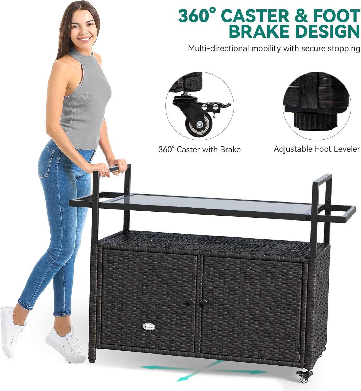 YITAHOME Large Outdoor Kitchen Wicker Island Rolling Cart, Patio Bar Table with Thickened Frame, Patio Storage Cabinet w/Wheels and Black Glass Table Top Backyard and Poolside Dark Brown