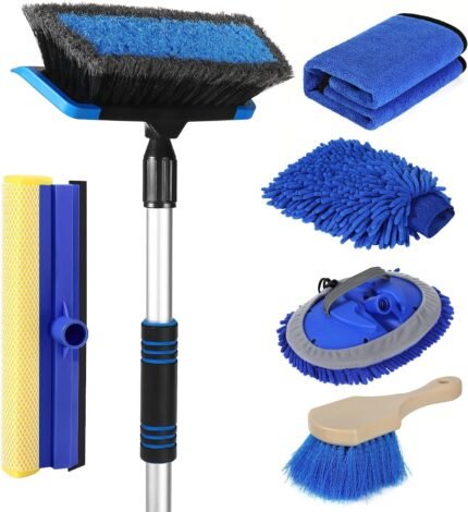 62” Car Wash Brush with Long Handle, Scratch-Free Soft Bristles Sturdy Car Wash Mop Kit, Complete Car Cleaning Brush Kit Wash Mitt Towel Windshield Squeegee Wheel Tire Brush for Car Truck RV