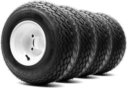 8″ Steel Golf Cart Wheels Glossy White and Arisun Turf Sail (18/8.5-8) Golf Cart Tires – Set of Four