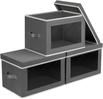Storage Bins with Lids – Fabric Storage Boxes with Lids, Collapsible Storage Bins with Window, Decorative Closet Organizers and Storage for Clothes, Towels, Books, 3 Pack, Dark Grey