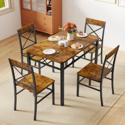 Zevemomo 5-Piece Dining Table Set, Breakfast Nook Table Set, Kitchen Table Chairs Set of 4, Small Dining Table Set for 4 X-Shaped Curved Backrest Chairs, for Small Spaces & Living Room-Rustic Brown
